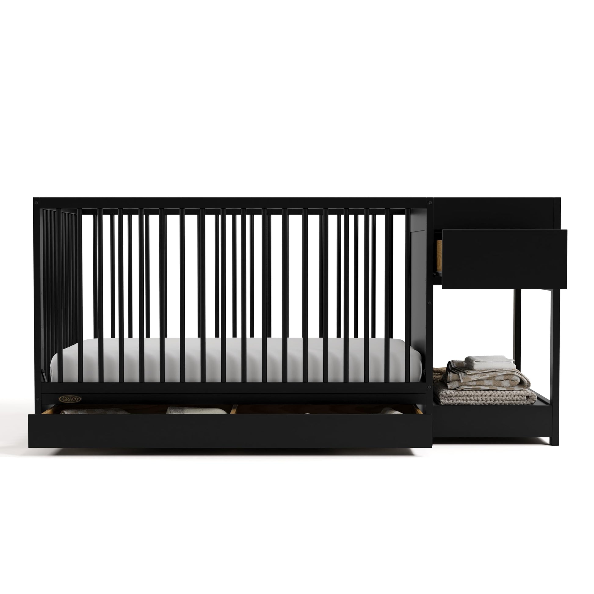 - Q: What additional features does the Graco Teddi crib offer? A: The crib includes a spacious under-crib drawer for storage, an attached changing table with an extra drawer and open shelf, and a water-resistant changing pad.