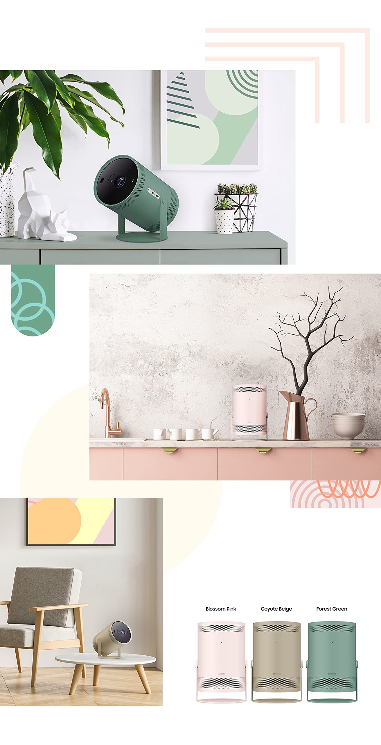 - Q: What colors are available for the SAMSUNG Freestyle Skin and Cradle Set? A: The SAMSUNG Freestyle Skin and Cradle Set is available in three colors: Blossom Pink, Forest Green, and Coyote Beige.