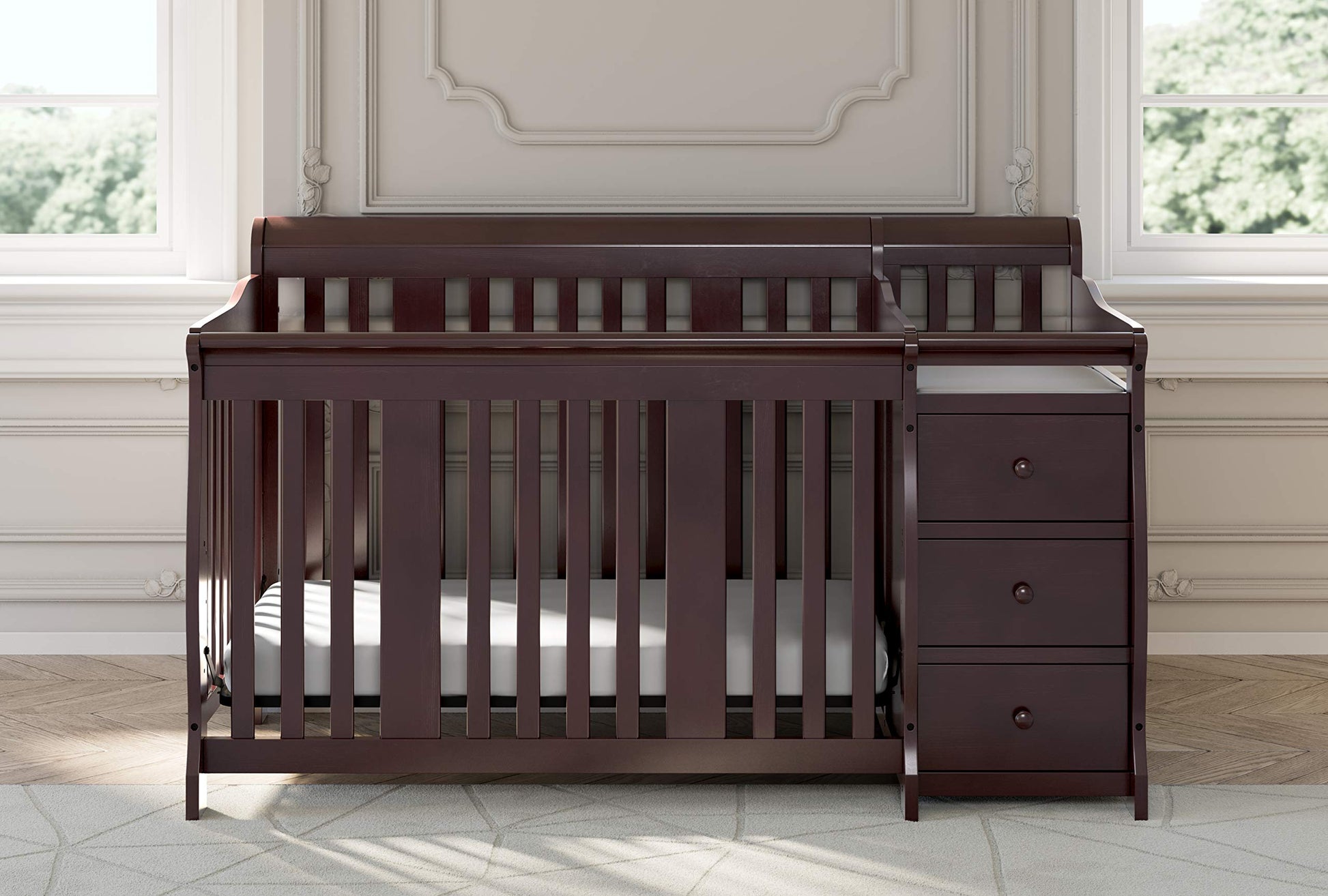 - Q: What features does the attached changing table include? A: The attached changing table includes three enclosed storage drawers and two open shelves, along with a water-resistant changing pad with a safety strap.