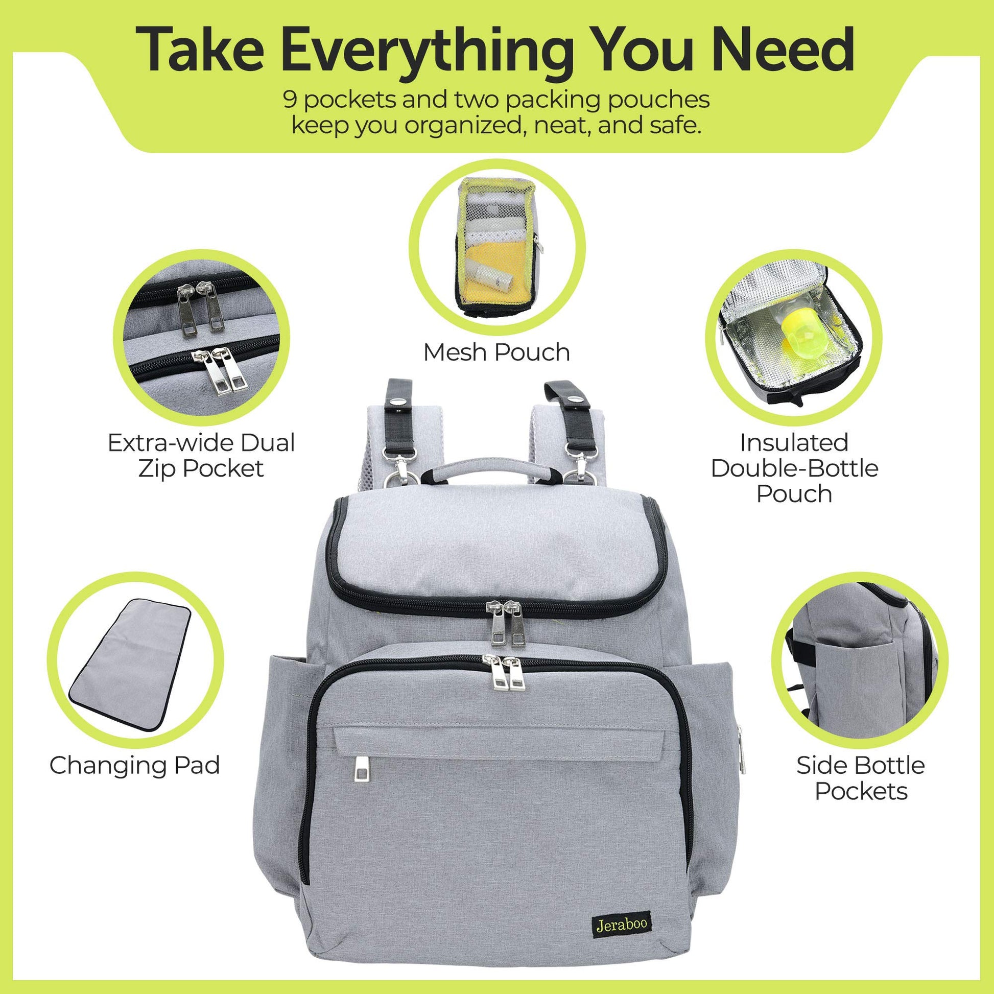- Q: Does the bag have insulated pockets? A: Yes, the diaper backpack features an insulated pouch that can hold two baby bottles and helps keep them warm or cool.