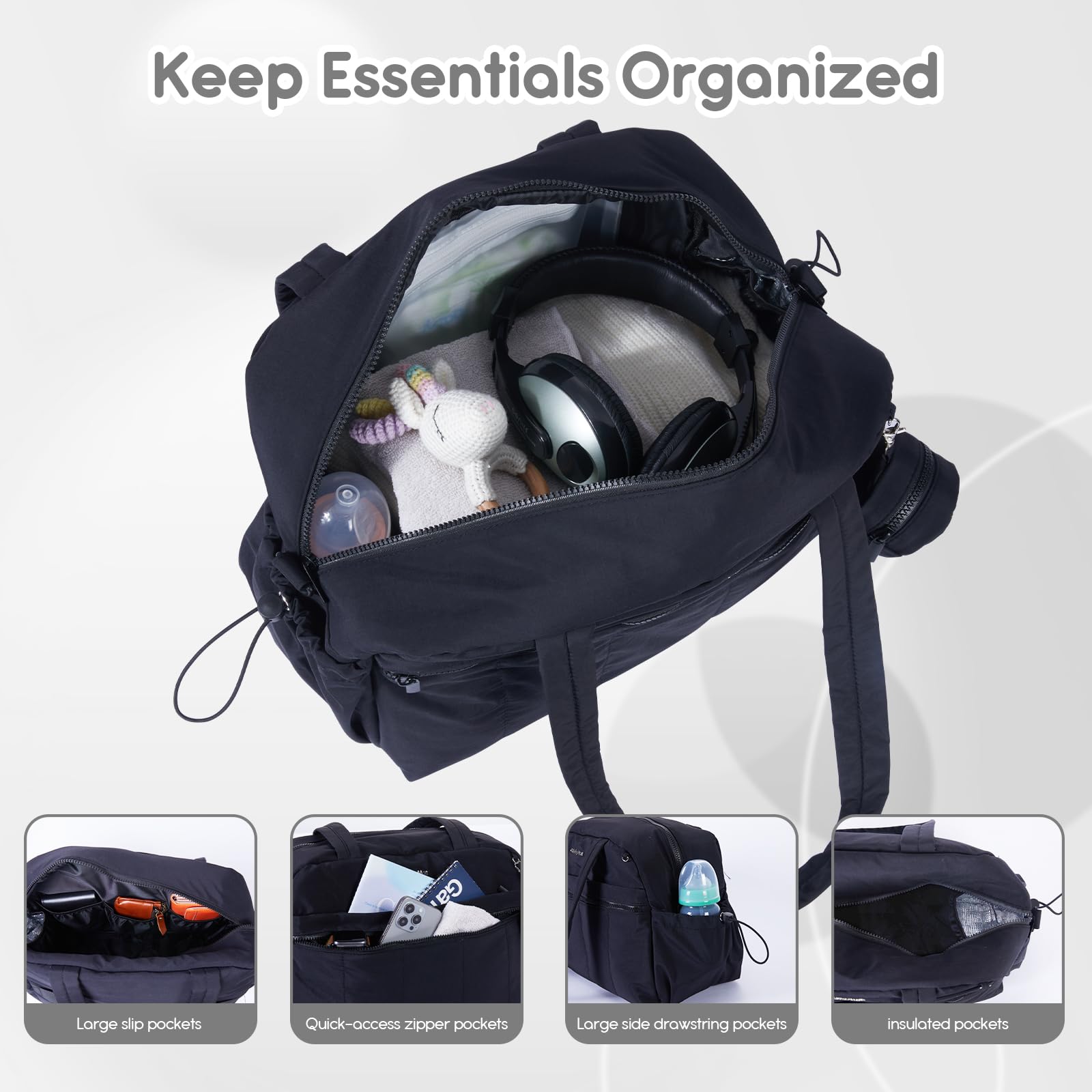 • Q: Can this bag be used for other purposes besides diapering? A: Yes, while designed as a diaper bag, its spacious and functional design makes it suitable for everyday use, travel, or as a general tote.