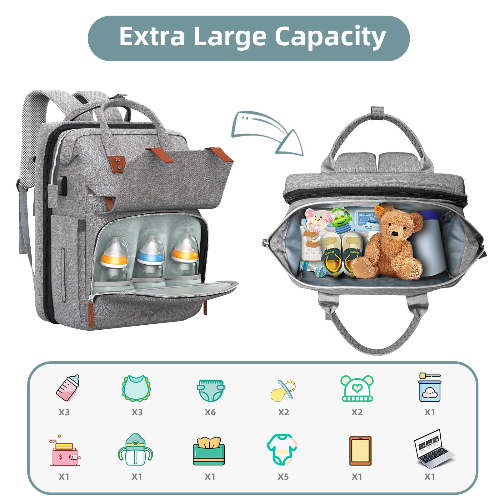 - Q: Are there any extra features in this diaper bag? A: Yes, additional features include cushioned shoulder straps, padded back panels, and a USB port for charging devices on the go.