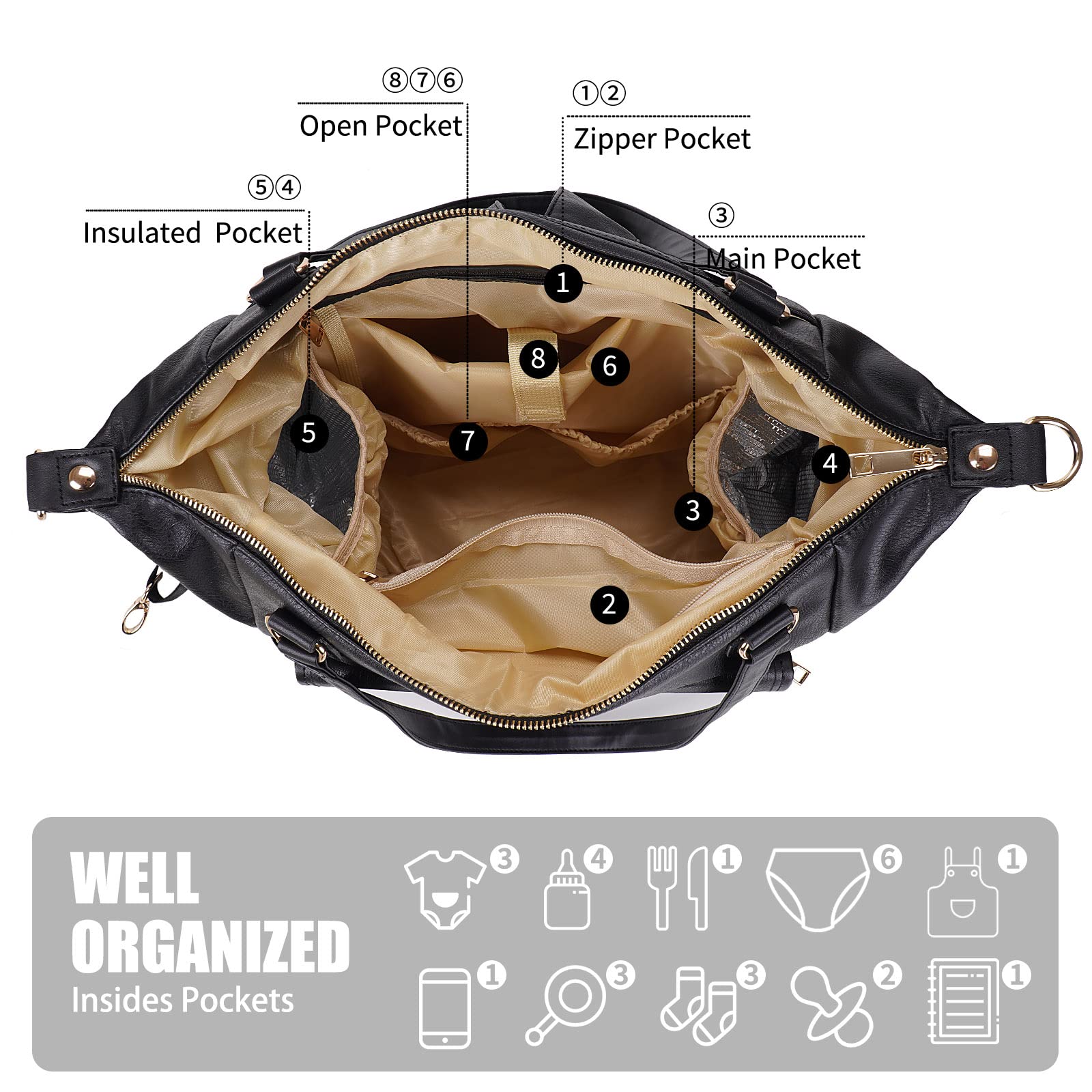 - Q: How many pockets does the diaper bag have? A: The Johomviin Diaper Bag has a total of 13 pockets: 5 outside pockets and 8 inside pockets, including insulated pockets for bottles.