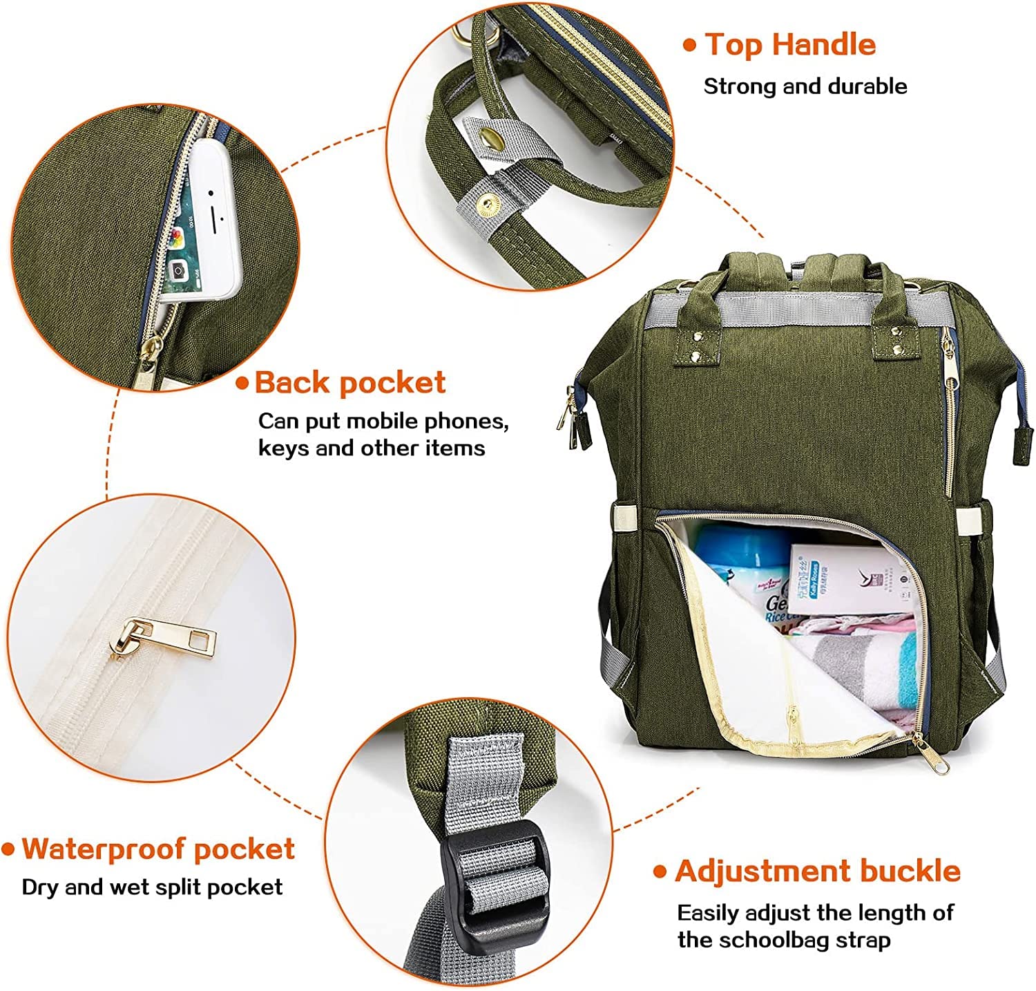- Q: What features does the diaper bag offer for organization? A: The backpack has a large-view multi-pocket design, with separate compartments for bottles, clothes, diapers, and other baby essentials, making it easy to organize.