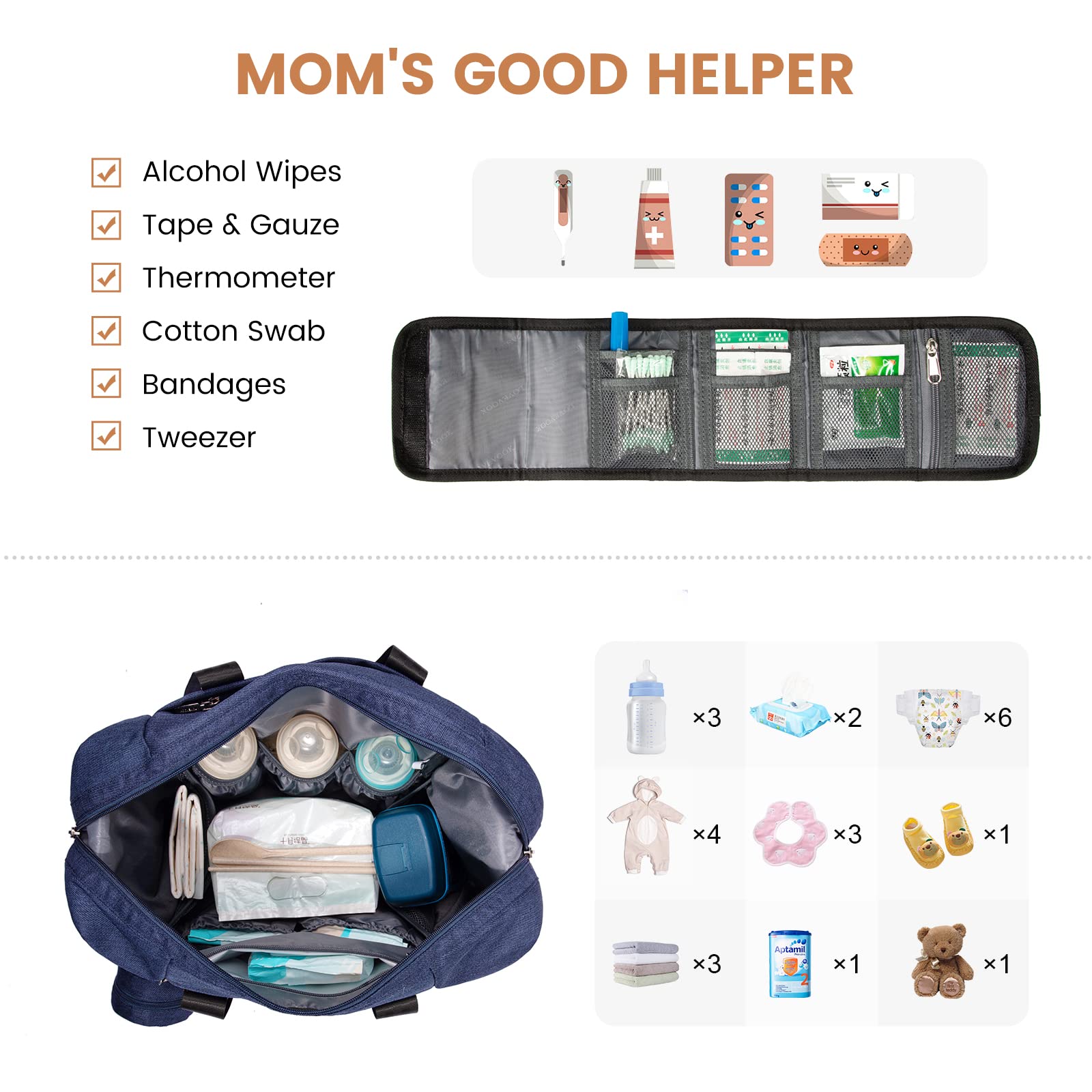 ?Multi-Pocket?-- Large Capacity: One wide-open main compartment with two-way zipper closure fits your large items, 3 insulated pouches for baby bottles, 1 waterproof Pocket for Wet Clothes, 1 separate pacifier box is more hygienic and convenient, other 12 pockets ensure you stay organized without digging around | ?Considerate Design?-- Diaper bag and first aid kit bag Combination can better meet the needs of mothers. Multi-compartment design for easy sorting of Band-Aids, tape, pills, etc. And it can be folded out for easy access | ?Comfortable and Durable?-- Our diaper tote is made of tear-resistant fabric, strong zippers and lining, it is lightweight but durable enough to sustain heavy weight. 8 round metal feet in the bottom to keep the mommy bag clean and off the ground | ?Easy to Carry?-- Baby diaper bag with portable changing pad is equipped with a detachable shoulder strap, flexible carrying method allows you to easily carry baby bag as a crossbody bag, shoulder bag or handbag.The handy Luggage sleeve design makes travel a breeze | What You'll Get?-- Large Baby Diaper Bag and a Small First Aid Kit Bag (Empty). LOVEVOOK diaper bag is a thoughtful gift for new mom and a must-have newborn necessity for your baby register