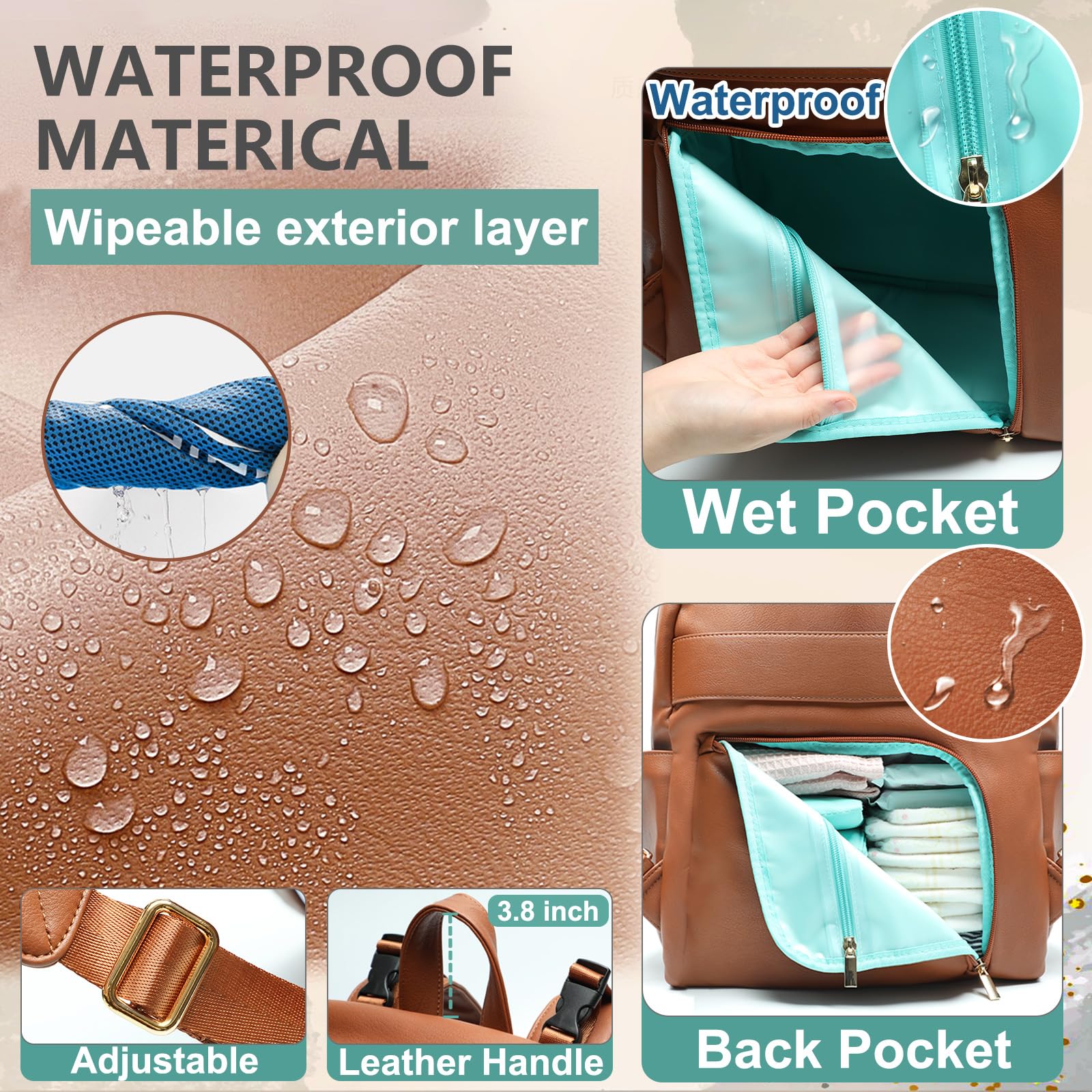- Q: What materials are used in the MOMINSIDE Diaper Bag Backpack? A: The MOMINSIDE Diaper Bag Backpack is made from 100% durable vegan leather for the outer material and 100% waterproof nylon for the inner lining.
