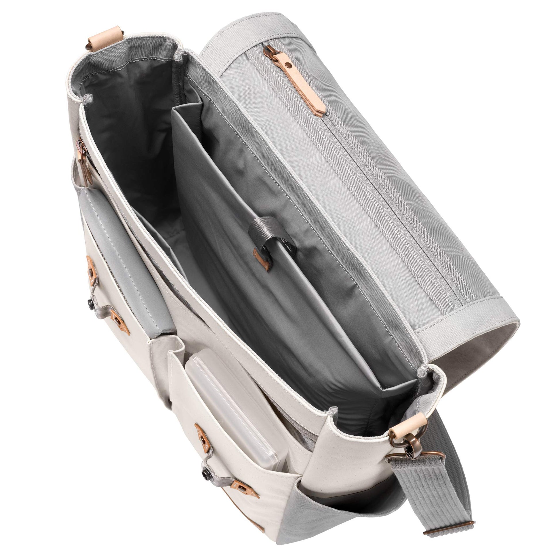 - Q: Does the bag have any compartments for organization? A: Yes, the bag features dual exterior open front pockets, one zippered front pocket, two side bottle pockets, and a water-resistant lined interior with two open pockets and one snap-close laptop pocket for organization.