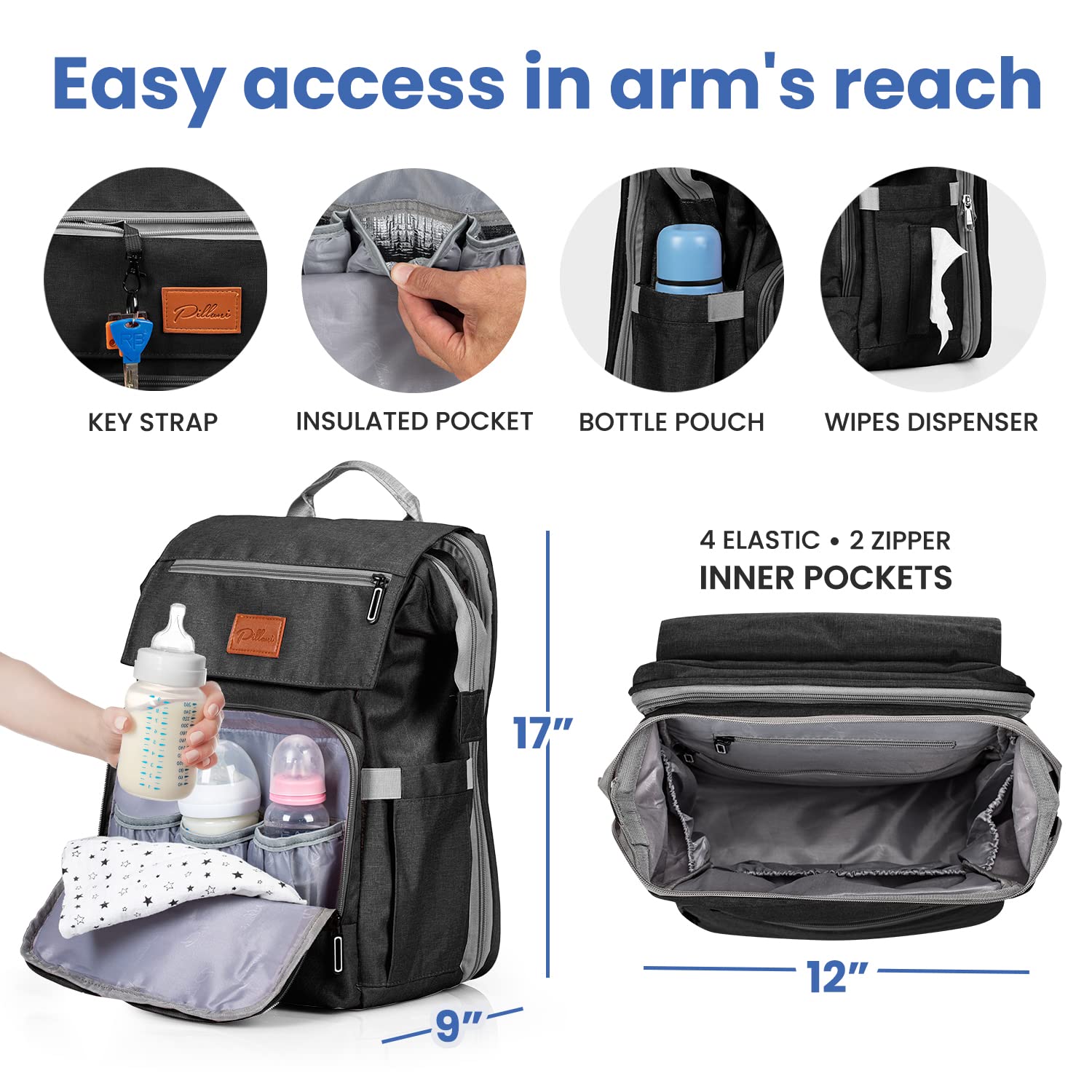 - Q: What type of baby items can I store in this diaper bag? A: You can store diapers, wipes, bottles, clothes, and other newborn essentials in the PILLANI Baby Diaper Bag Backpack.