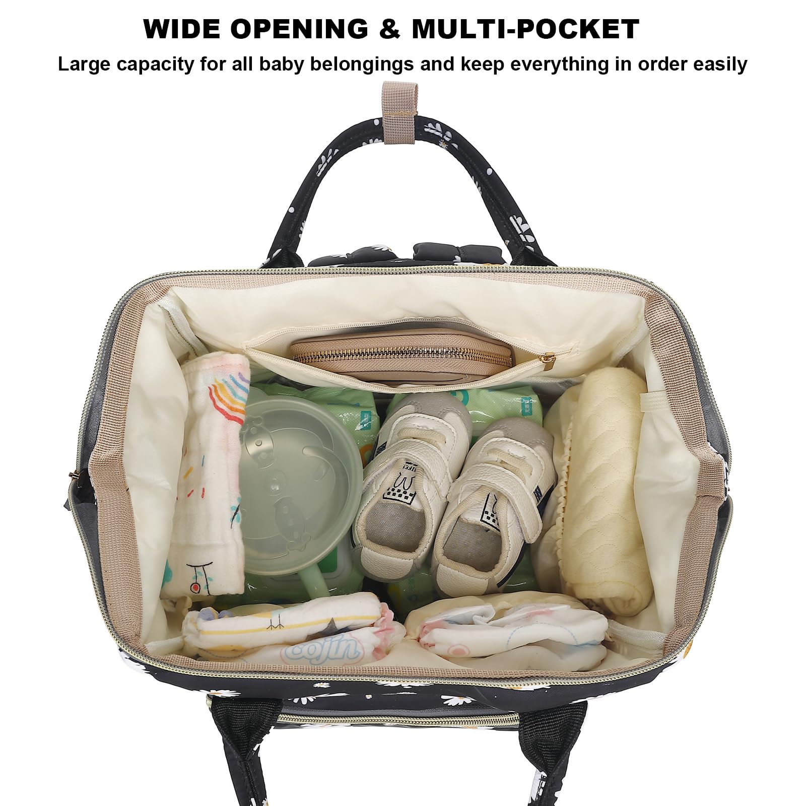 - Q: What colors are available for the Xunteny Daisy Baby Diaper Bag? A: The Xunteny Daisy Baby Diaper Bag Backpack is available in black.