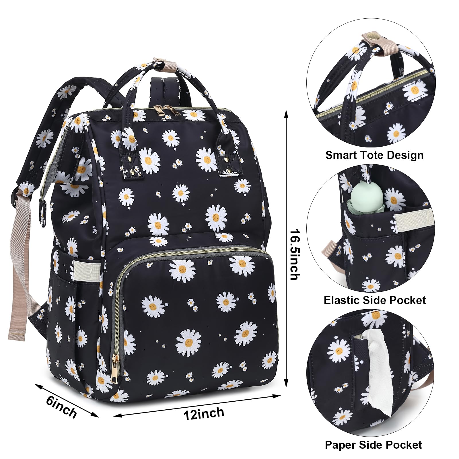 - Q: What are the dimensions of the Xunteny Daisy Baby Diaper Bag Backpack? A: The dimensions of the Xunteny Daisy Baby Diaper Bag Backpack are 12 inches wide, 6 inches deep, and 16.5 inches tall.