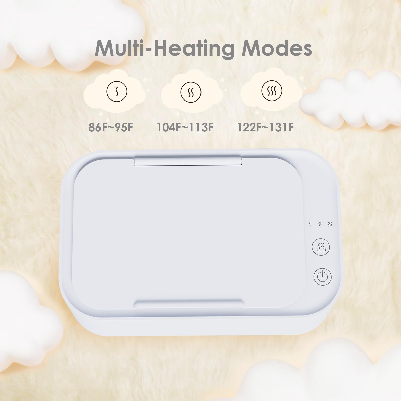 - Q: What are the heating modes available in this product? A: The wipe warmer features three heating modes: Low (86 to 95 degrees Fahrenheit), Medium (104 to 113 degrees Fahrenheit), and High (122 to 131 degrees Fahrenheit), allowing you to choose the temperature that best suits your needs.