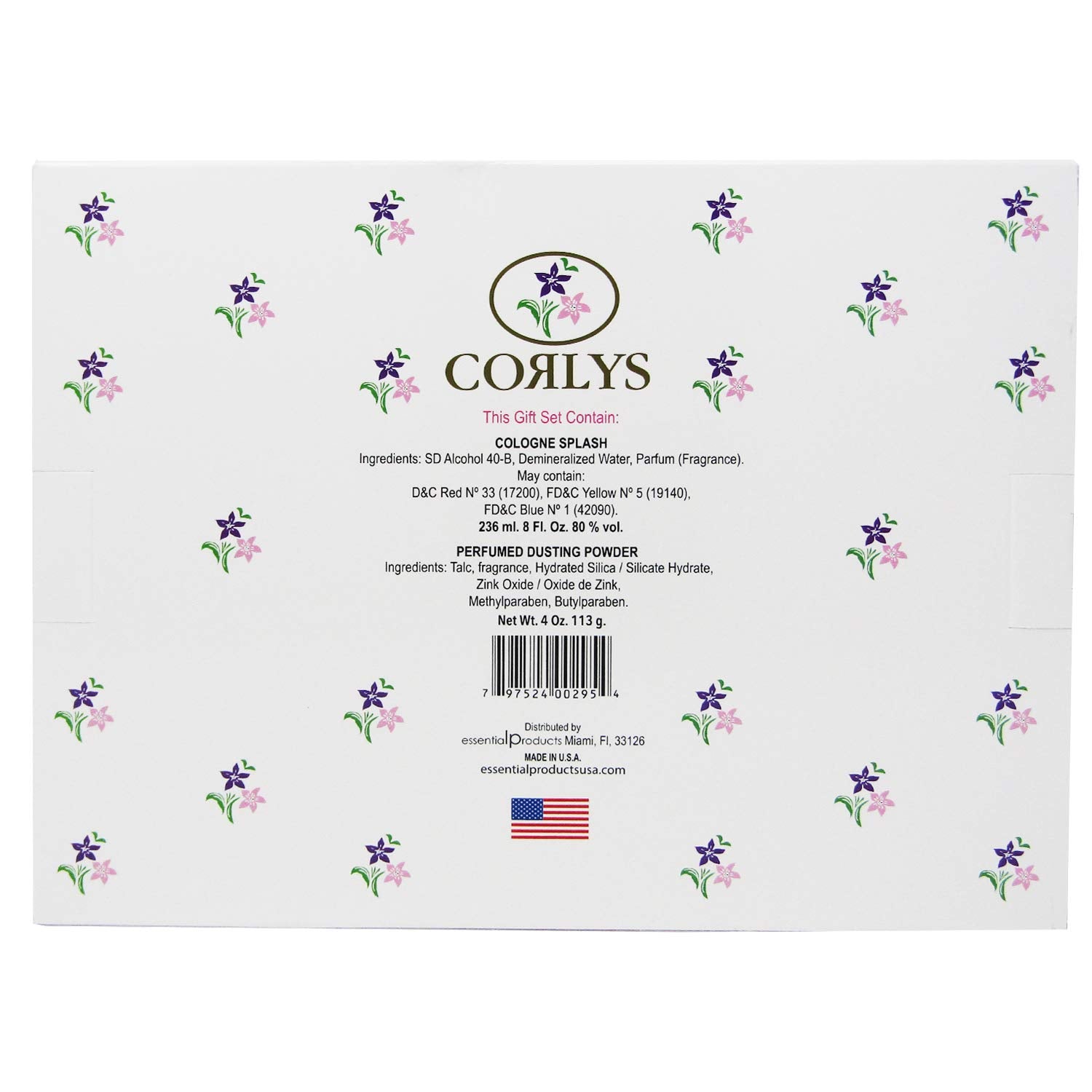 - Q: What is included in the Corlys Violet Baby Cologne and Dusting Powder set? A: The set includes an 8 oz bottle of Corlys Violet Baby Cologne and a 4 oz box of perfumed dusting powder.