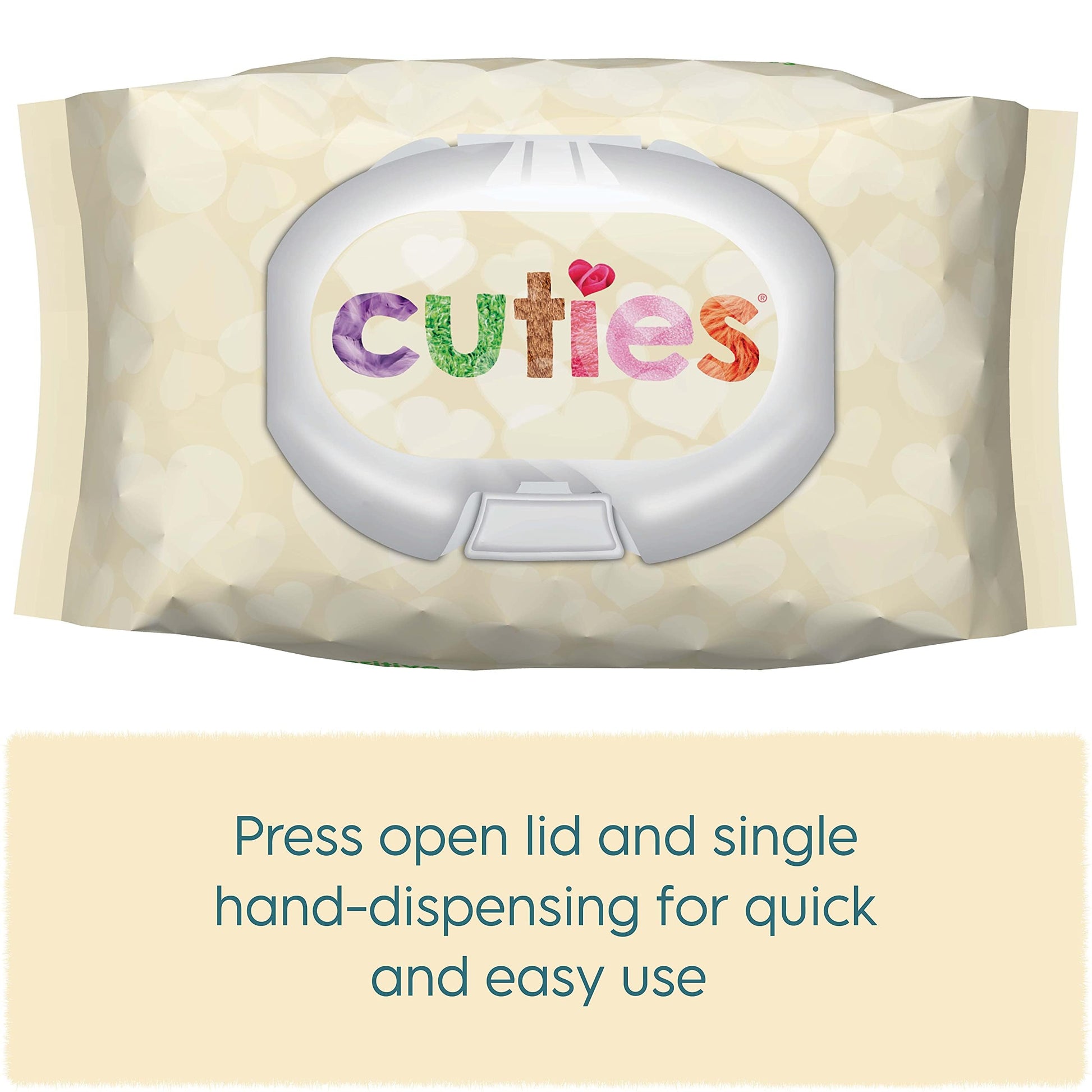 - Q: How do I open the Cuties Baby Wipes pack? A: The pack features a convenient push button lid that allows for easy one-handed dispensing of the wipes.