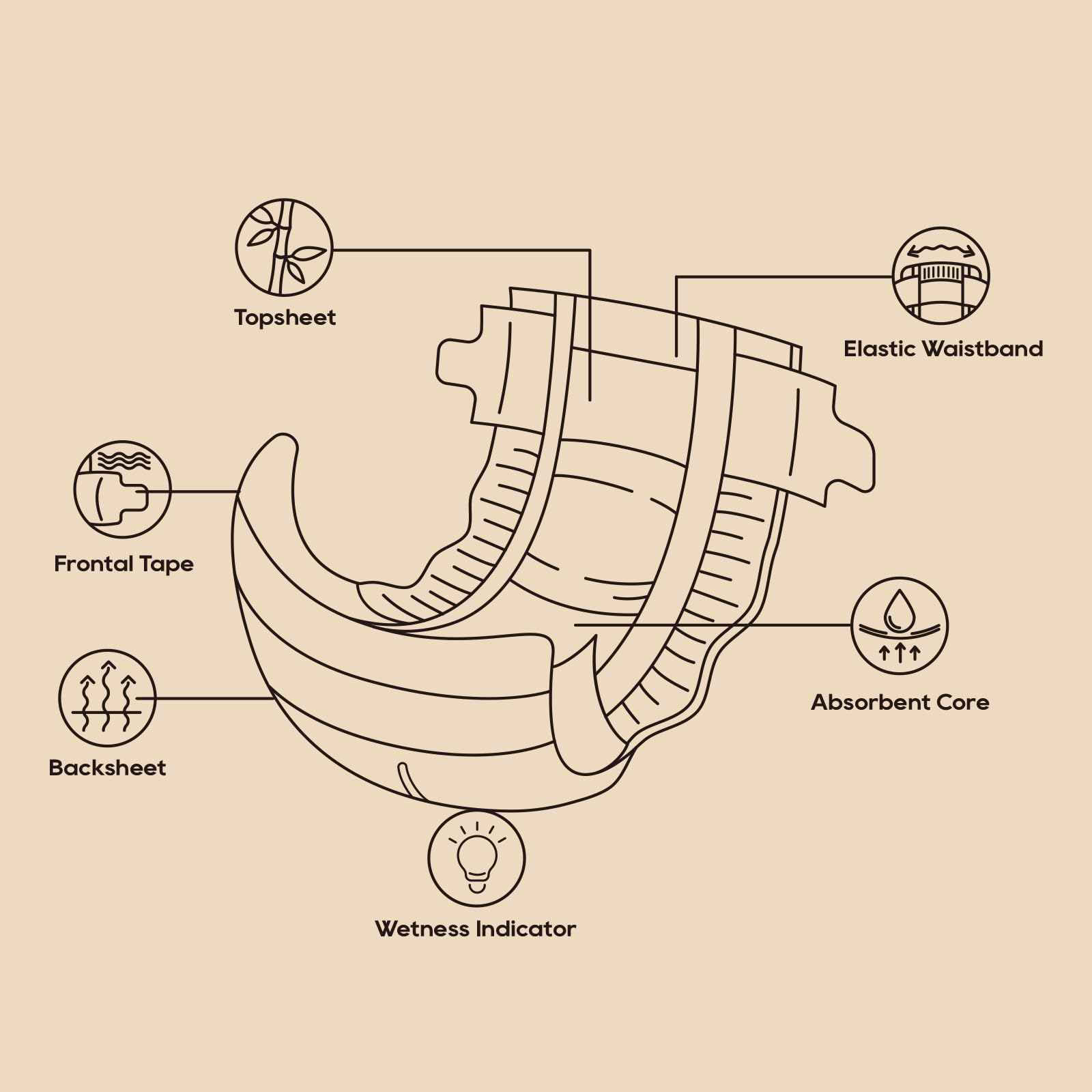 101% Bamboo Viscose Topsheet Elastic Waistband Super Absorbent Core Wetness Indicator Ultra Breathable Bamboo Viscose Backsheet Soft Frontal Tape