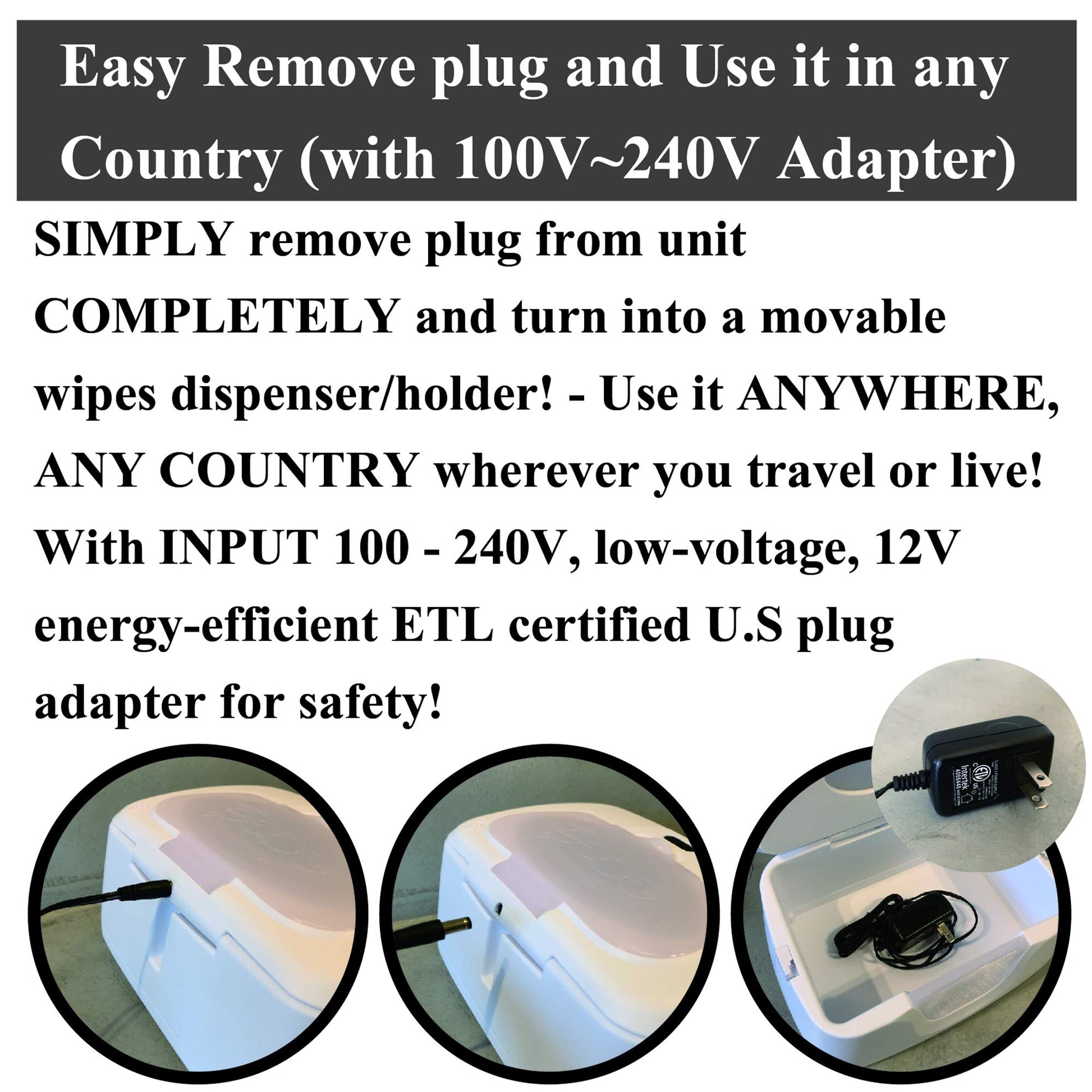 - Q: Is the wipe warmer safe for travel? A: Yes, the GOGO pure Baby Wipe Warmer operates on low-voltage, 12V energy-efficient power and has a plug that is compatible with input of 100 to 240 volts, making it suitable for use worldwide, although a plug adapter may be needed.