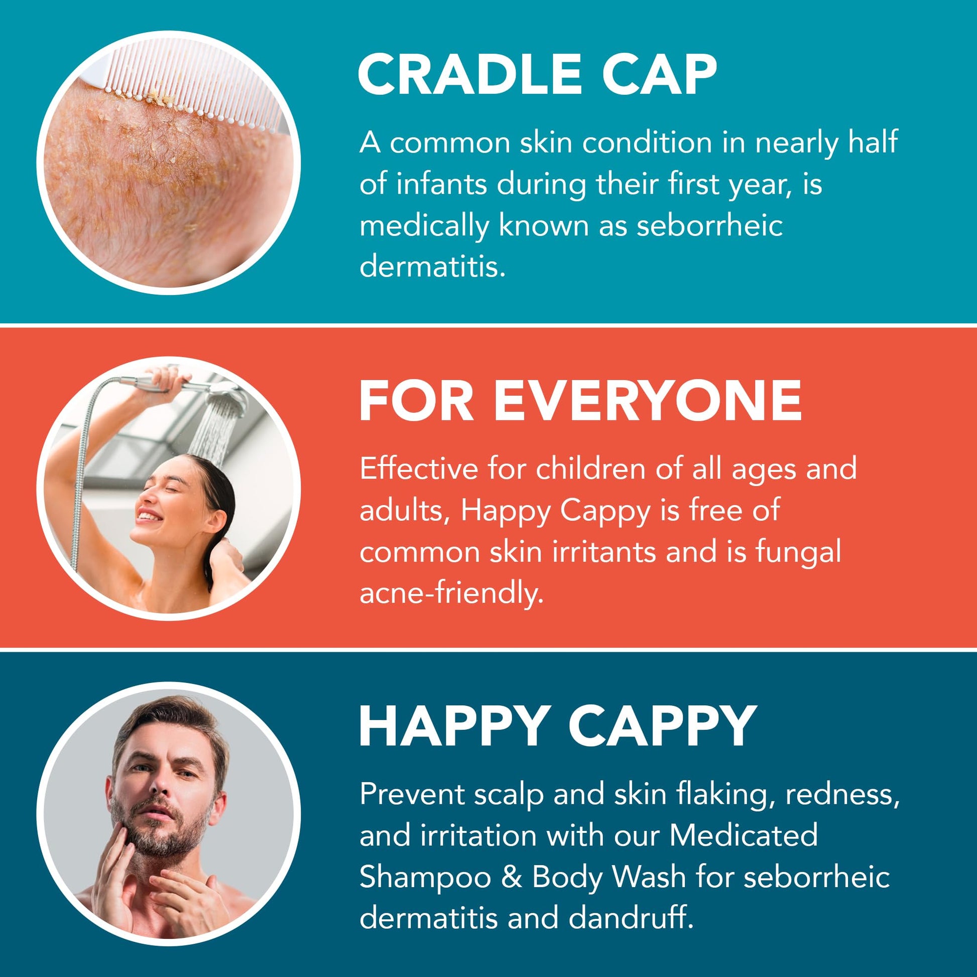 - Q: What is Happy Cappy Medicated Shampoo and Body Wash used for? A: Happy Cappy Medicated Shampoo and Body Wash is designed to help treat baby dandruff, cradle cap, and seborrheic dermatitis. It provides gentle cleansing for sensitive skin while soothing irritation.