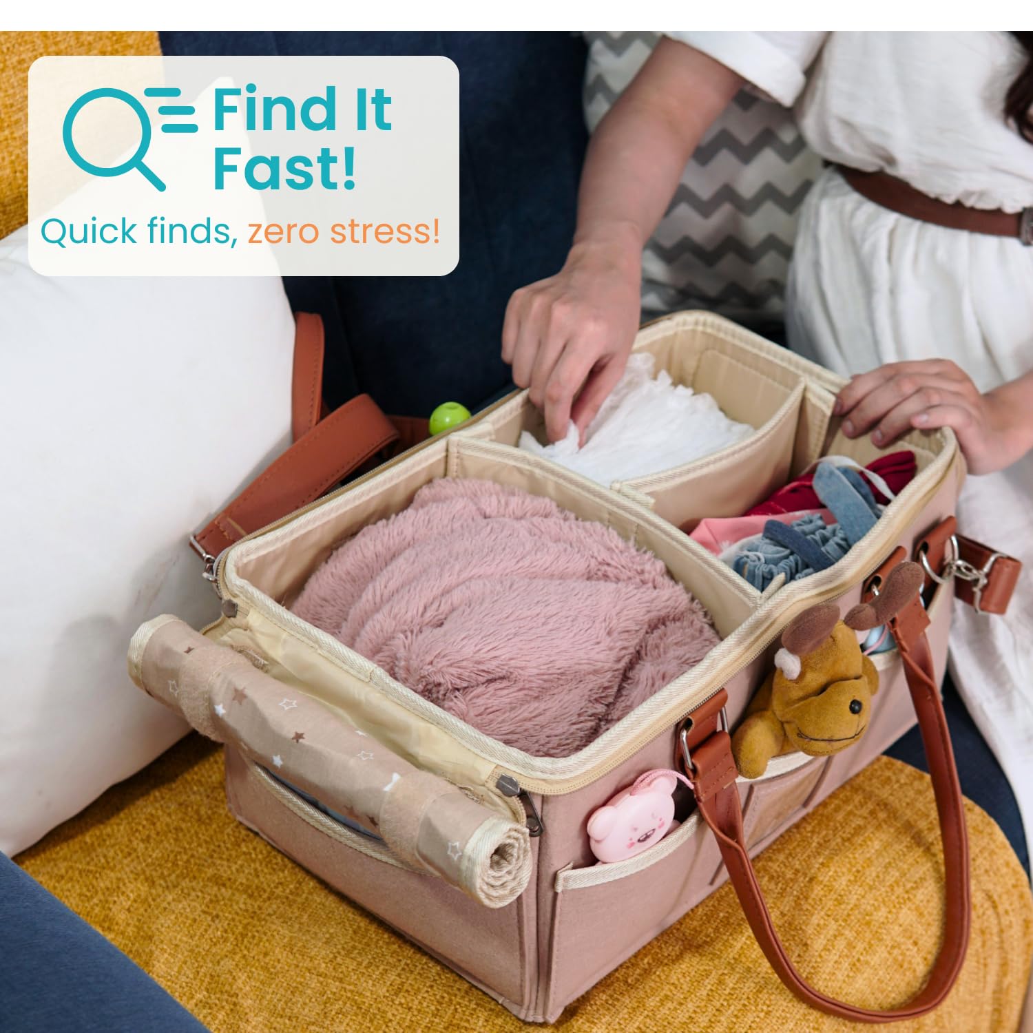 - Q: Does the diaper caddy come with dividers? A: Yes, the diaper caddy features adjustable and removable dividers to help organize your baby's essentials.