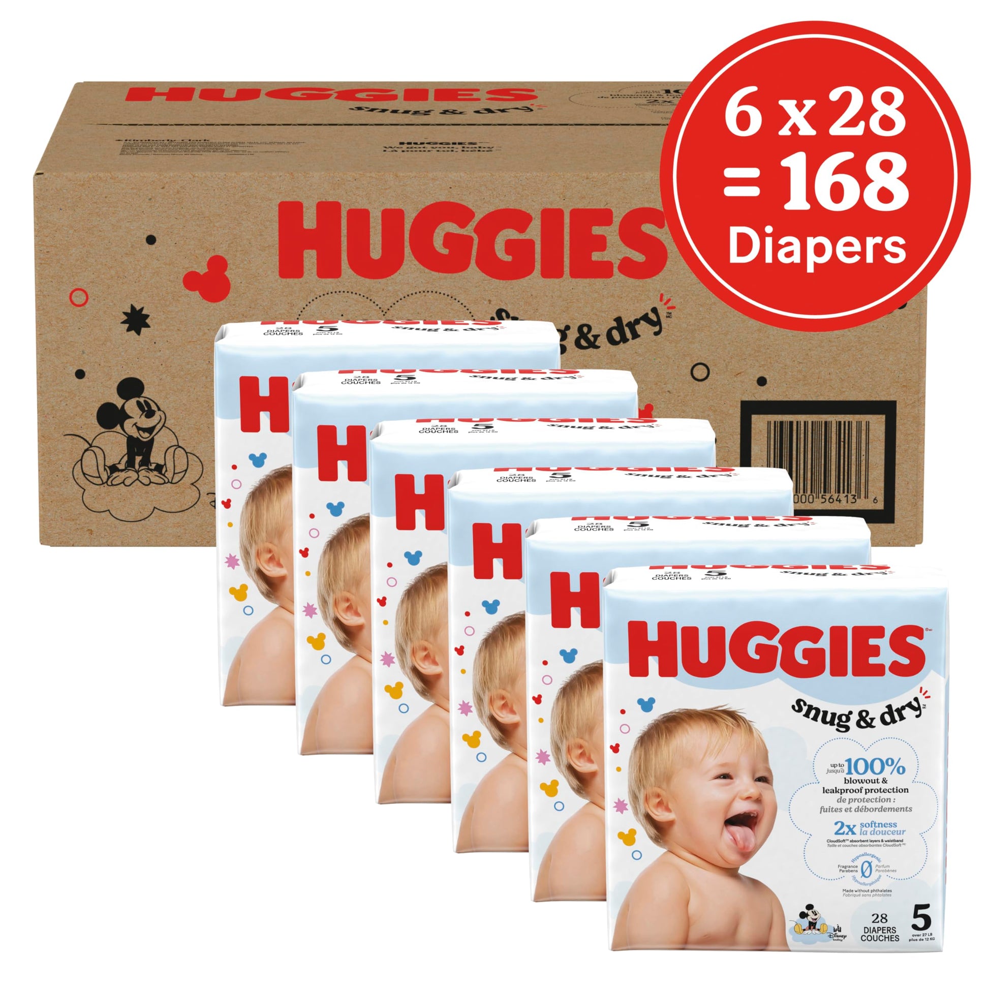 - Q: Do Huggies Size 5 Diapers have any special designs? A: Yes, Huggies Snug & Dry Diapers are available in exclusive Disney designs.