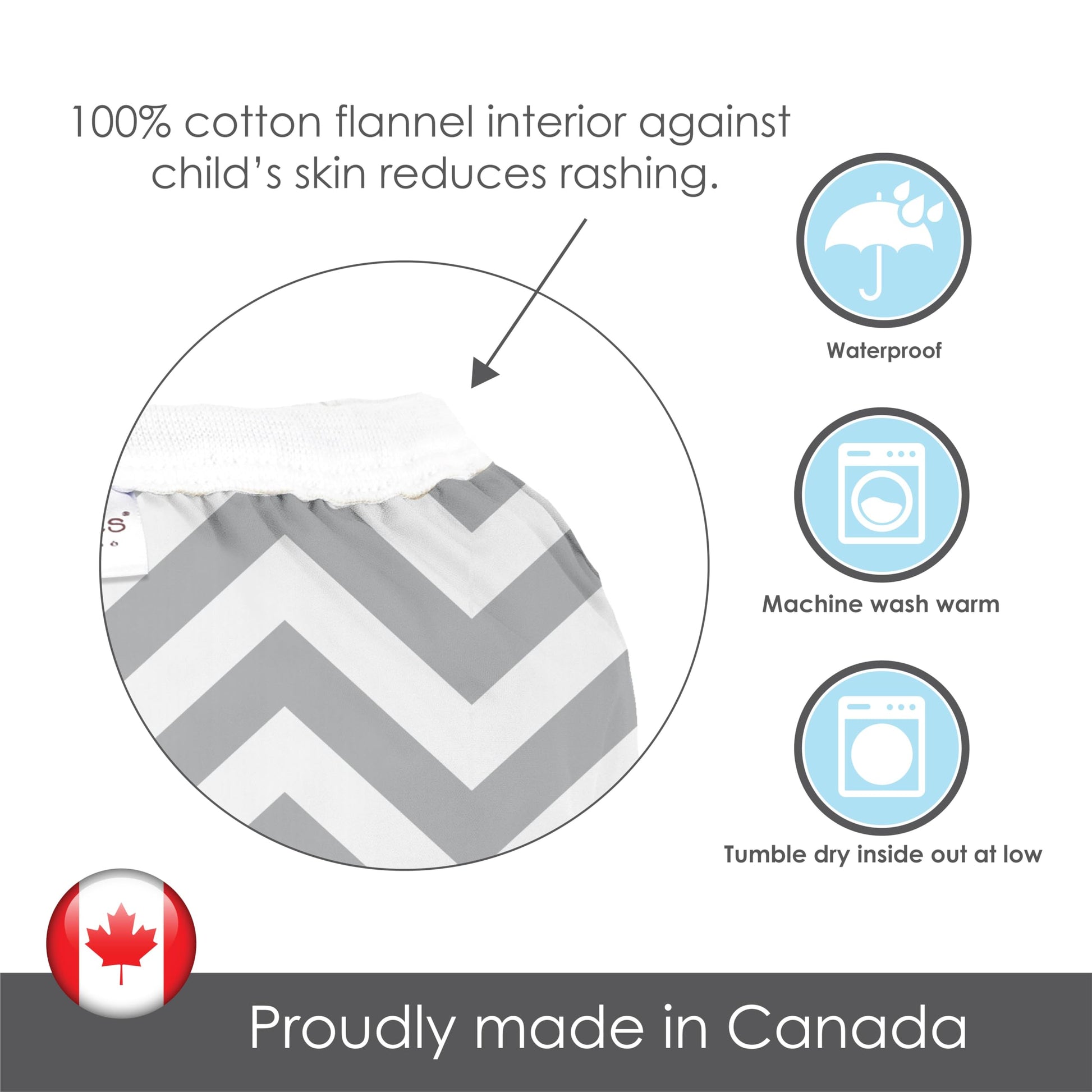 - Q: What material is used in these training pants? A: The outer layer is made from lightweight taffeta, while the inner layer is 100% cotton flannel, providing comfort and absorbency.
