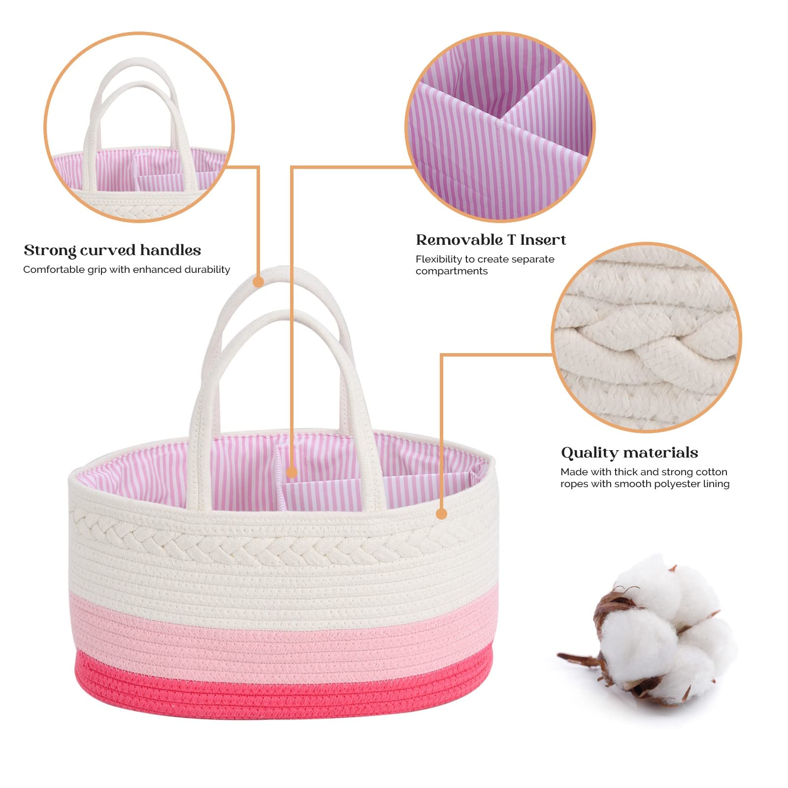 - Q: What materials are used in the diaper caddy? A: The diaper caddy is made of soft cotton rope, ensuring durability and a gentle touch for handling baby items.