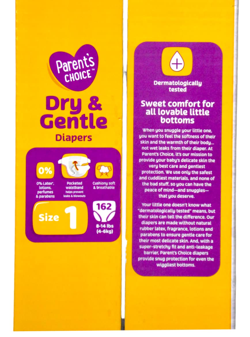 - Q: Are these diapers safe for sensitive skin? A: Yes, Parent's Choice Dry & Gentle Diapers are dermatologically tested and do not contain latex, lotions, perfumes, or parabens, making them suitable for sensitive skin.