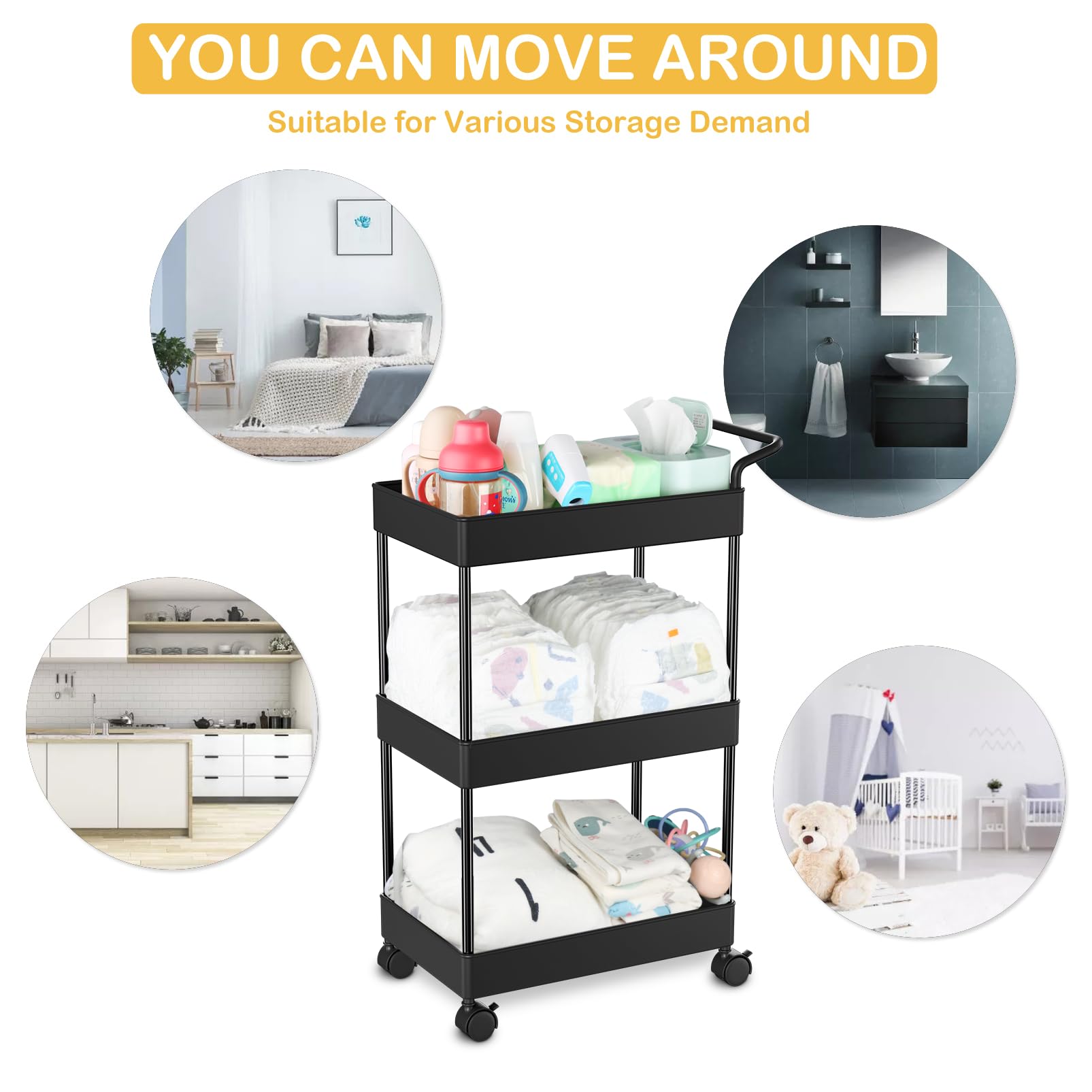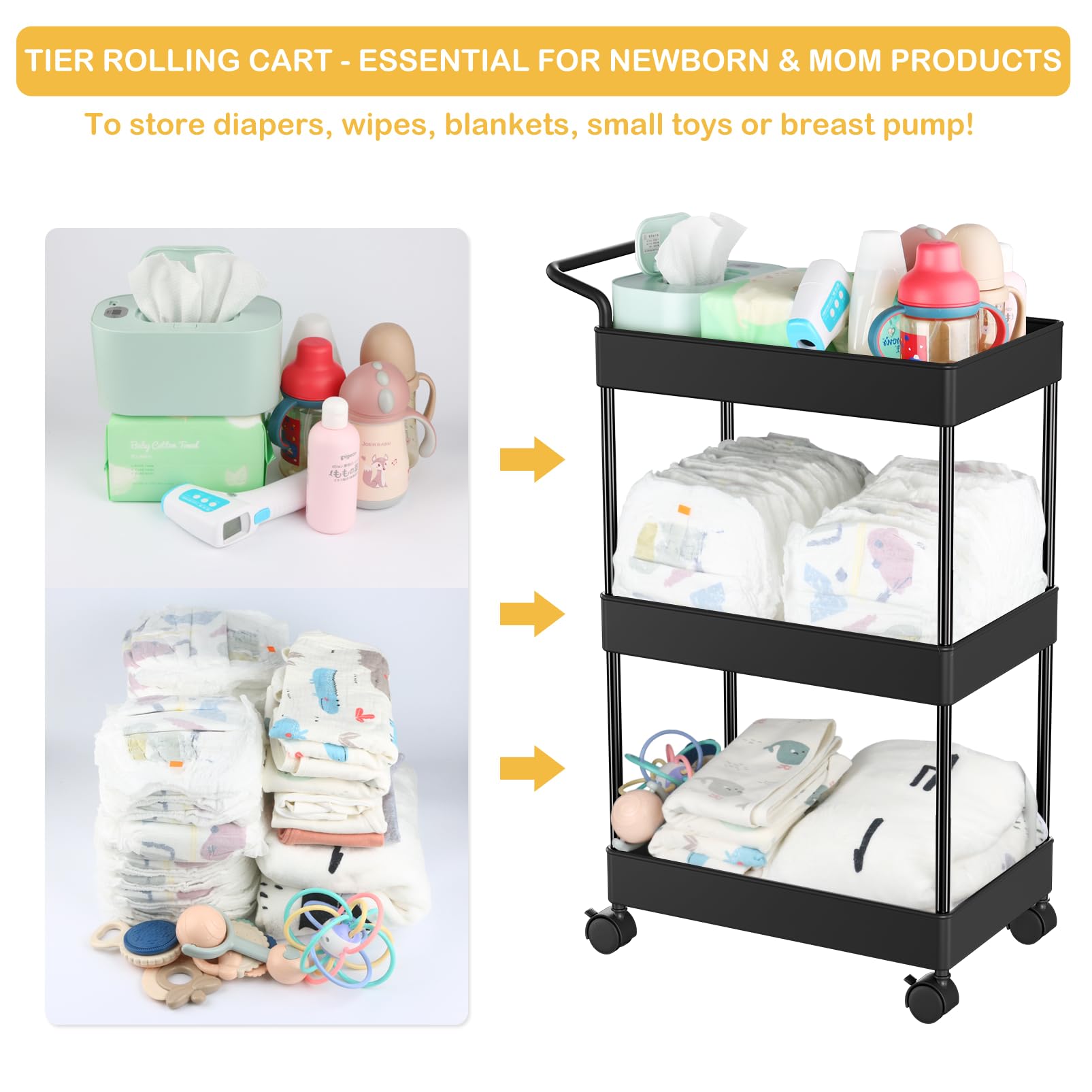 Baby Diaper Caddy Organizer, 3-Tier Sturdy Diaper Cart for Newborn Nursery Essentials, Diapers and Baby Wipes