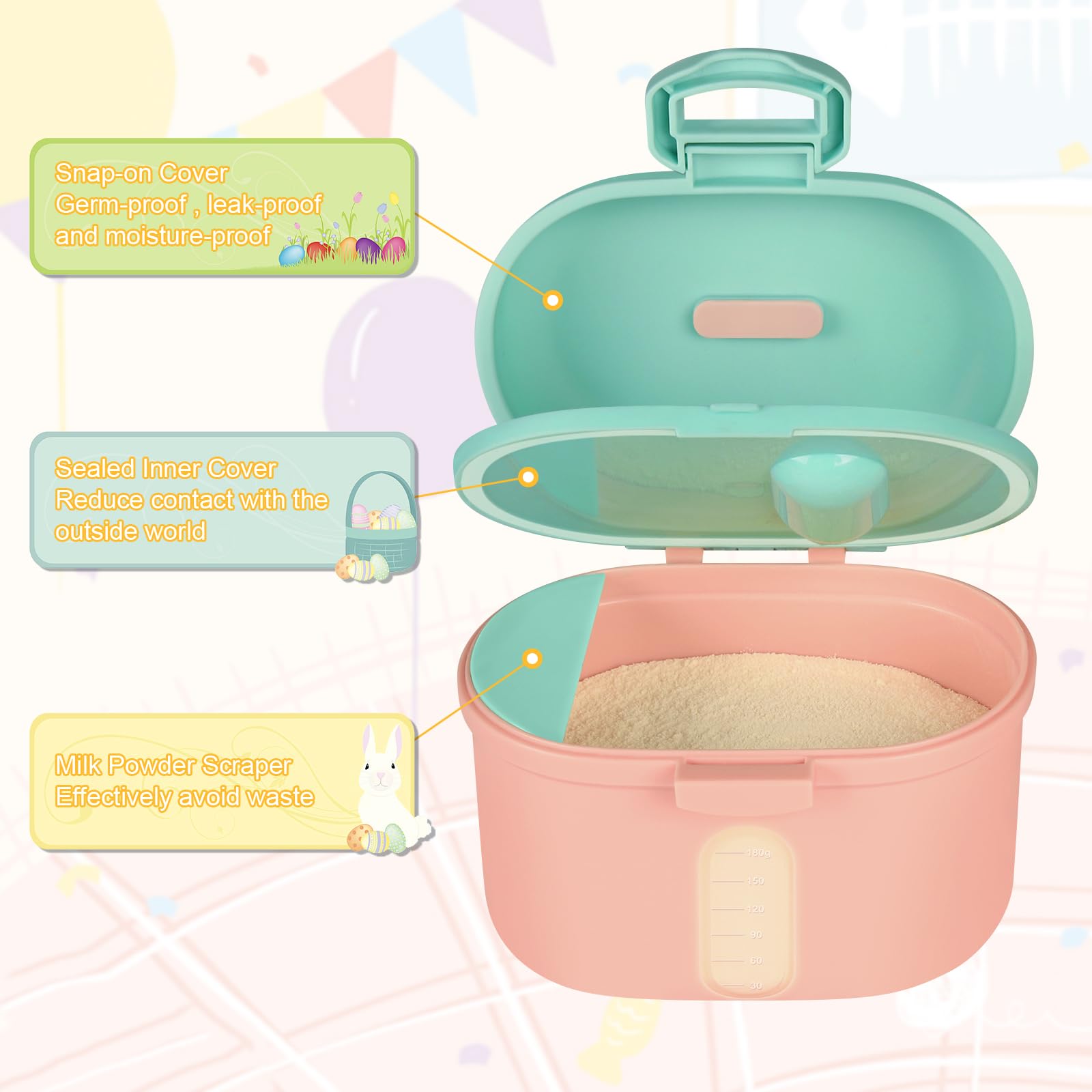 - Q: How does the sealing mechanism work to keep formula fresh? A: The dispenser features an inner lid with a silicone sealing ring and an outside lid with a buckle design, providing a double barrier to maintain freshness.
