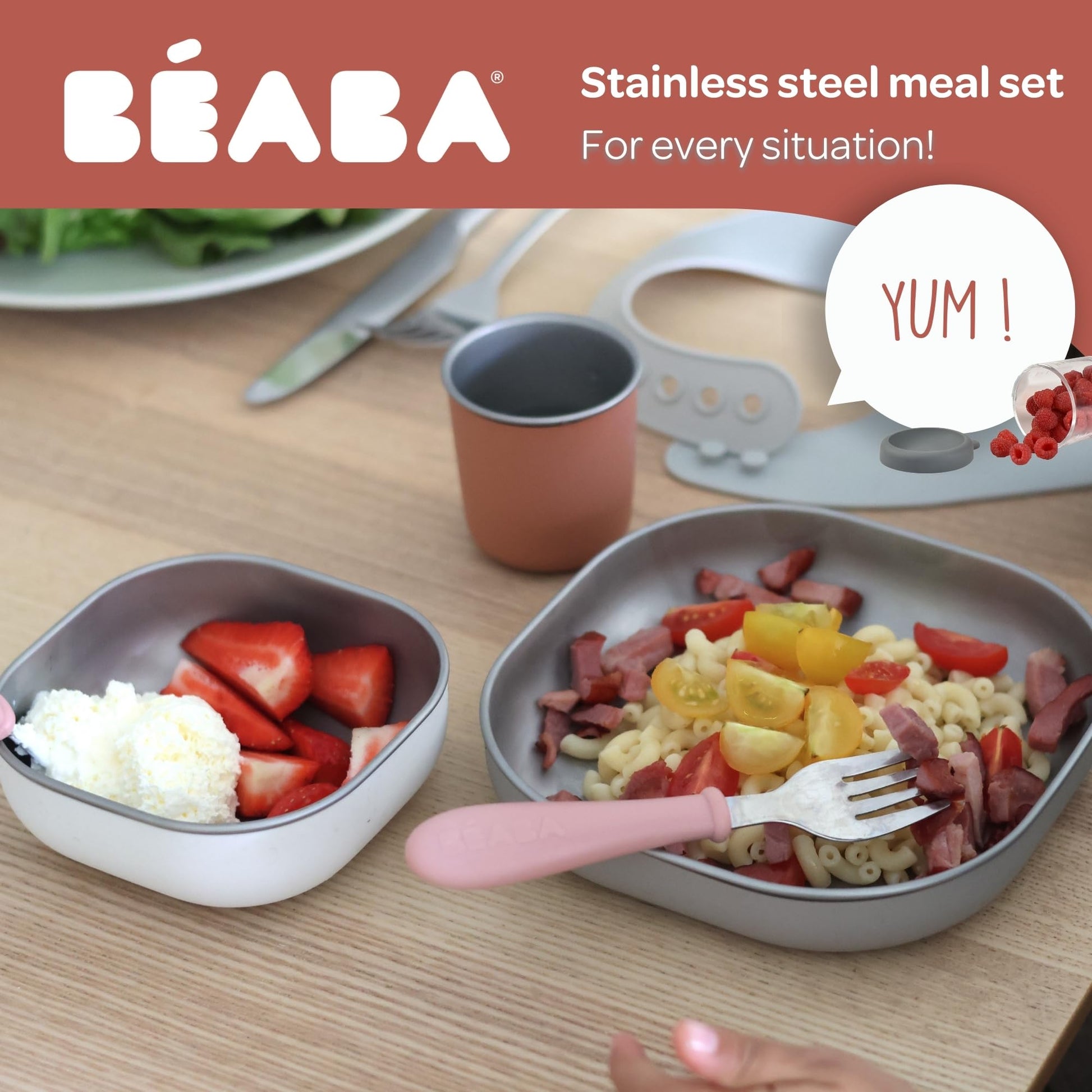 - Q: What materials are used in the BEABA meal set? A: The meal set is made from durable, food-grade stainless steel and features an anti-slip silicone cover.