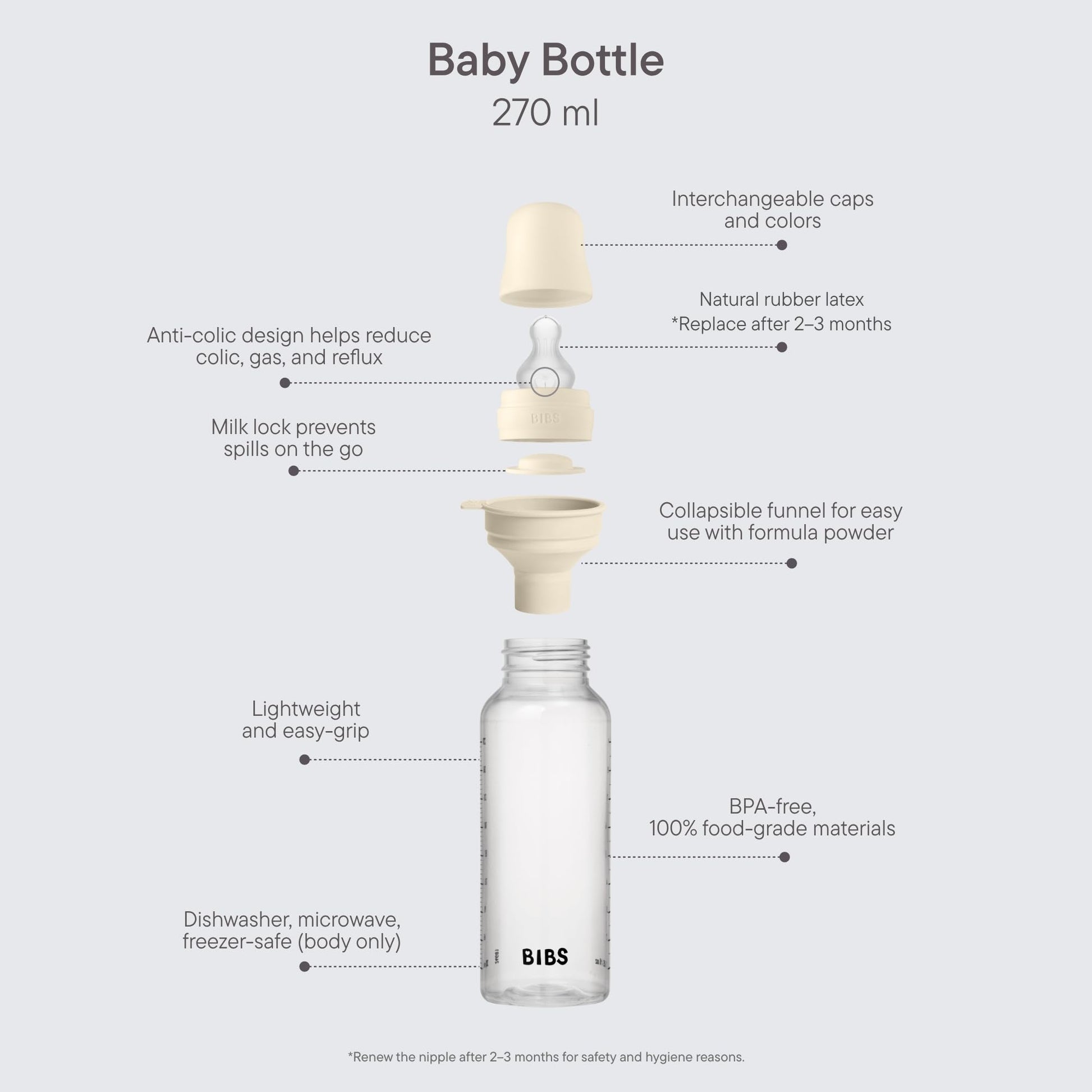 - Q: What is the capacity of the BIBS Baby Bottle? A: The BIBS Baby Bottle has a capacity of 9 ounces, which is approximately 270 milliliters.