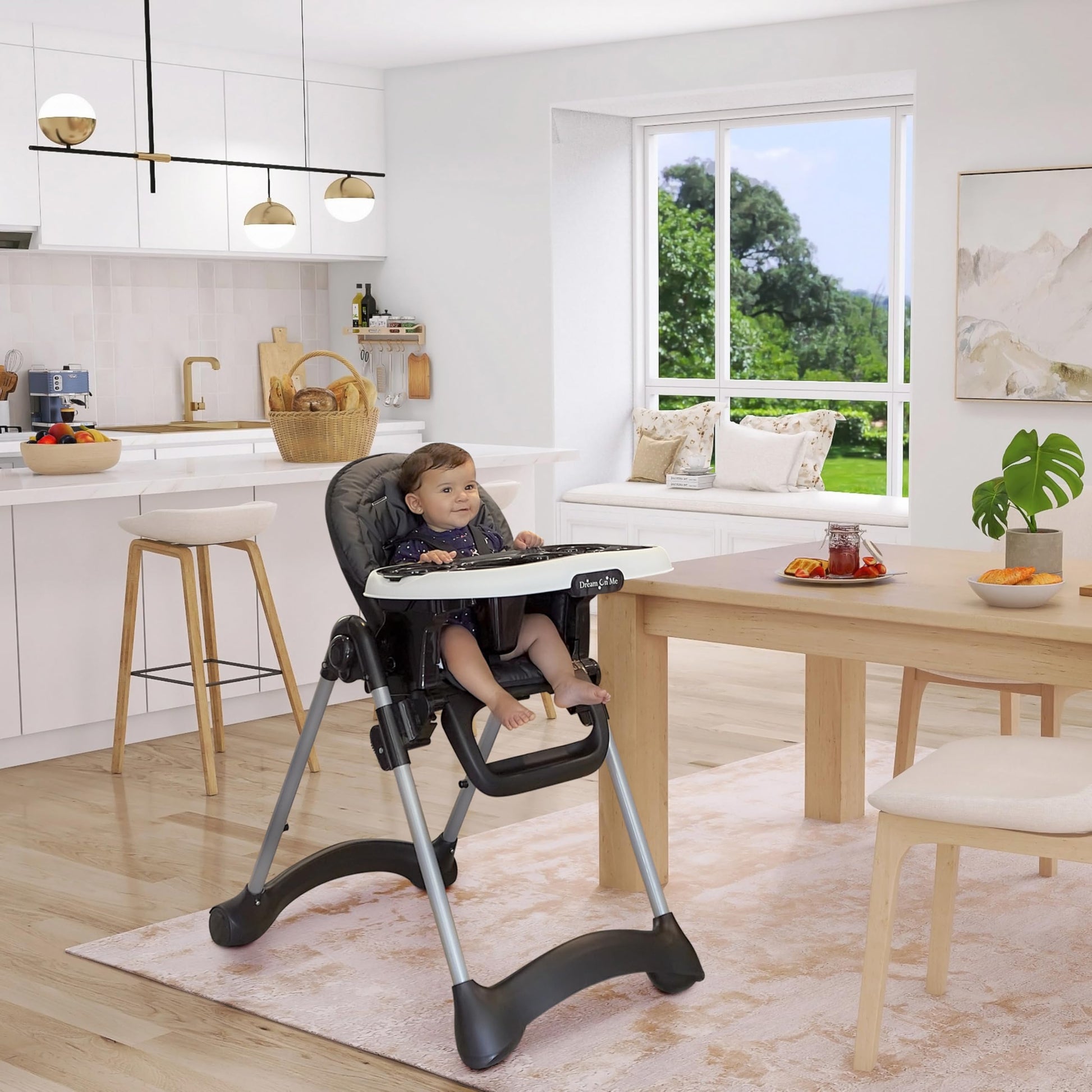 - Q: Does the high chair have adjustable features? A: Yes, it features a 5-position adjustable height, a 5-position adjustable seat recline, and a 3-position adjustable double tray.