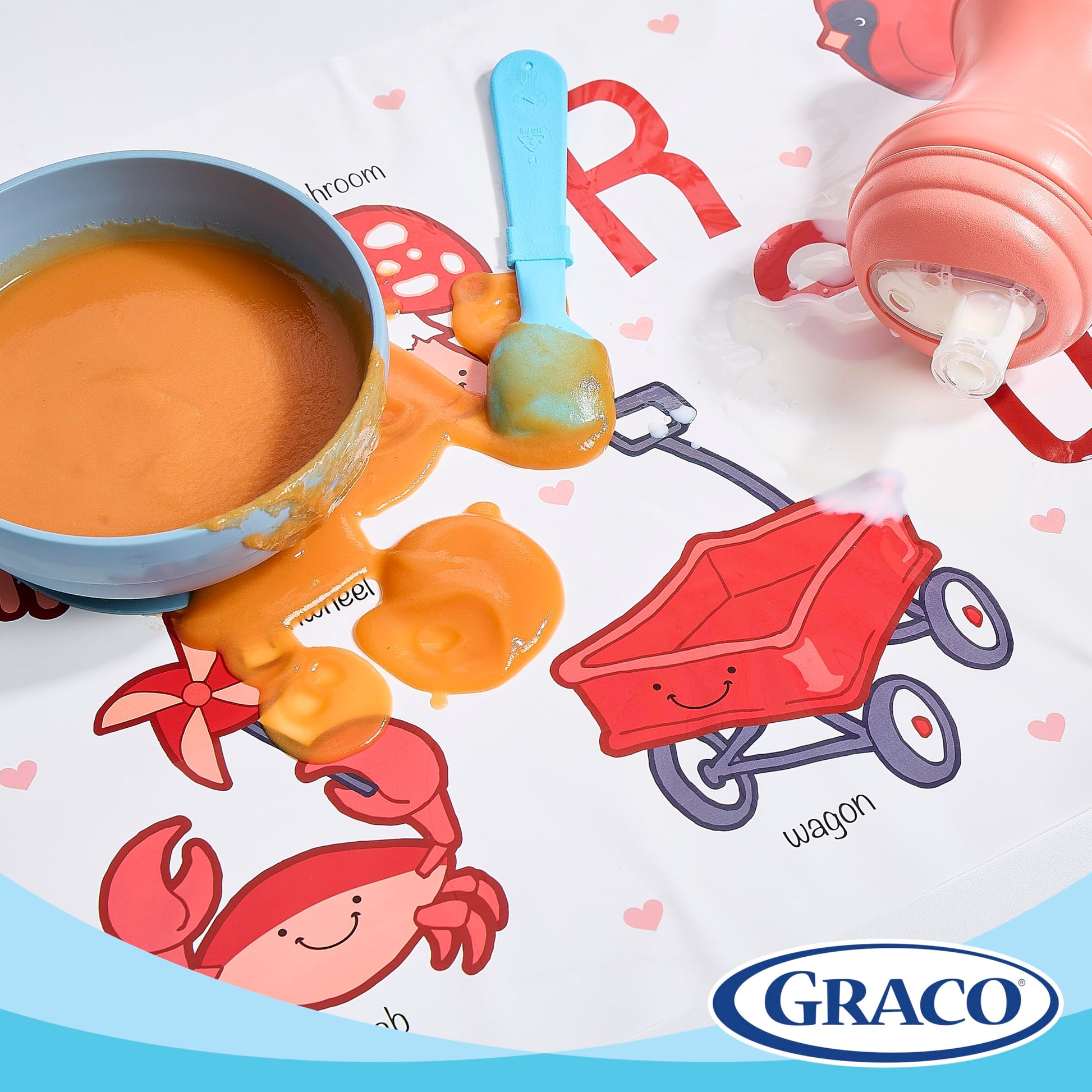 - Q: What sizes do the Graco Baby Disposable Stick-On Placemats come in? A: The Graco Baby Disposable Stick-On Placemats measure 12 inches by 18 inches.
