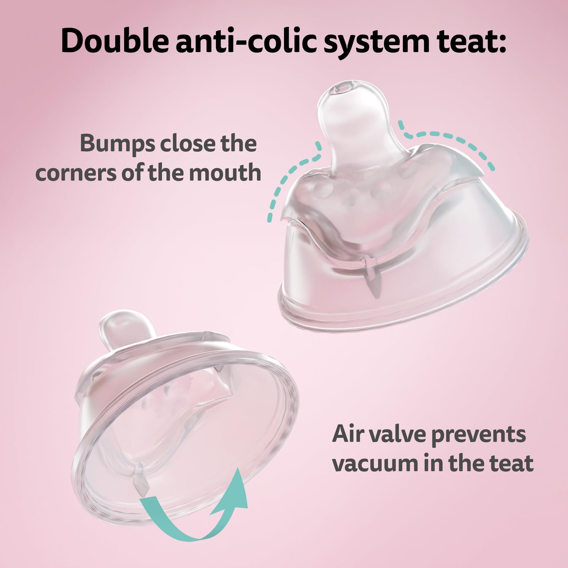 - Q: What features make these baby bottles anti-colic? A: These baby bottles feature a unique double anti-colic system with ergonomically shaped teats that close the corners of your baby's mouth, preventing them from swallowing air and forming a vacuum inside the bottle.