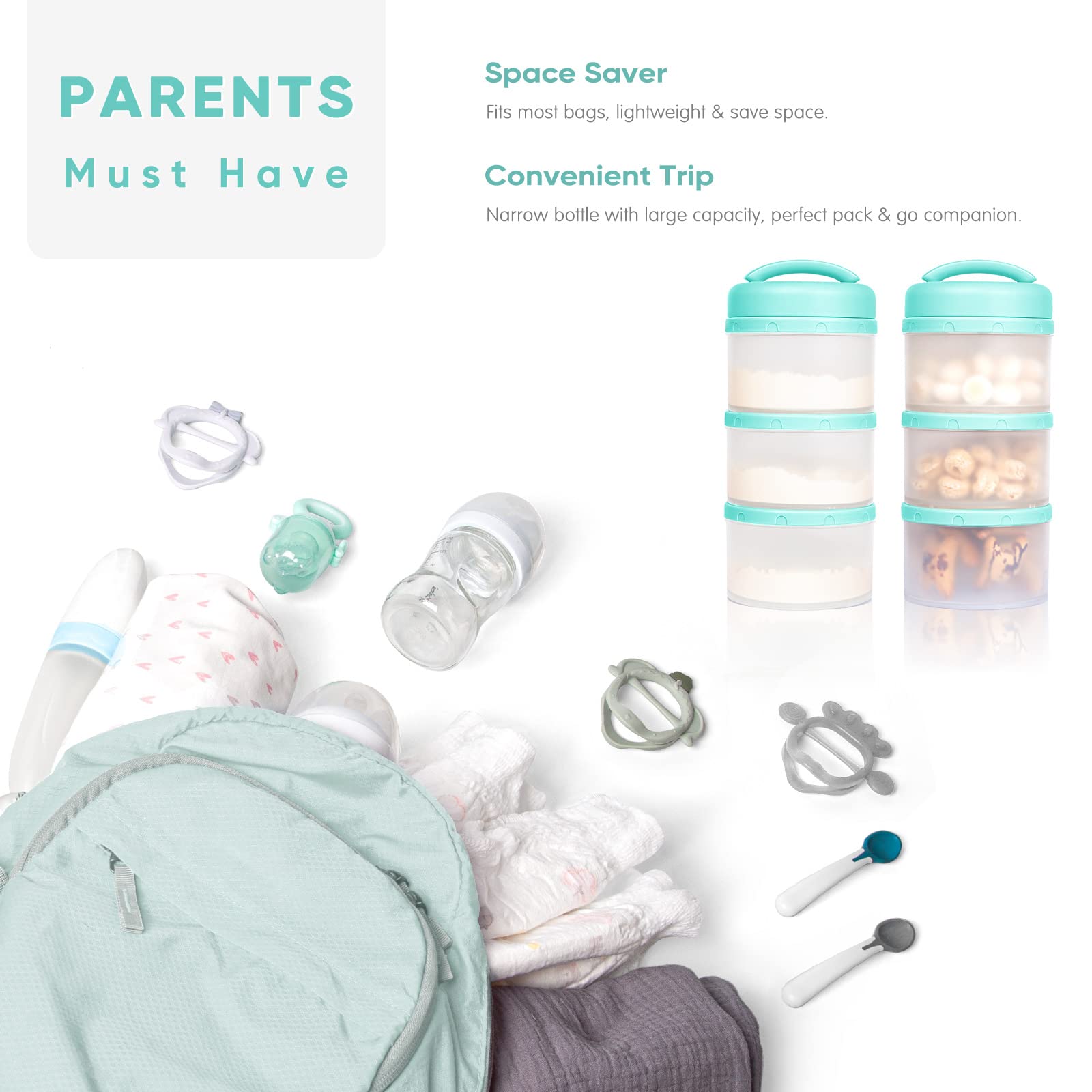 - Q: What features make this dispenser easy to use? A: The independent funnel spouts allow for easy pouring without spills, and the stackable design saves space in your diaper bag.