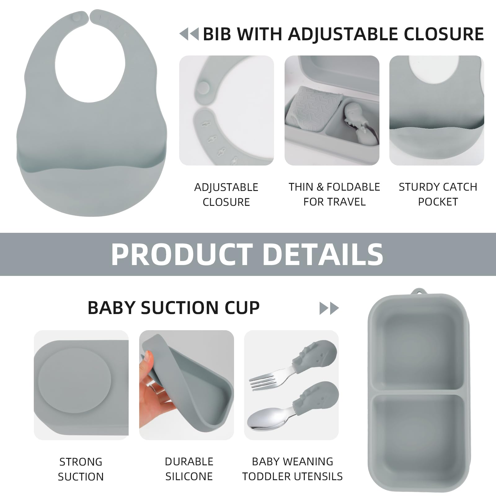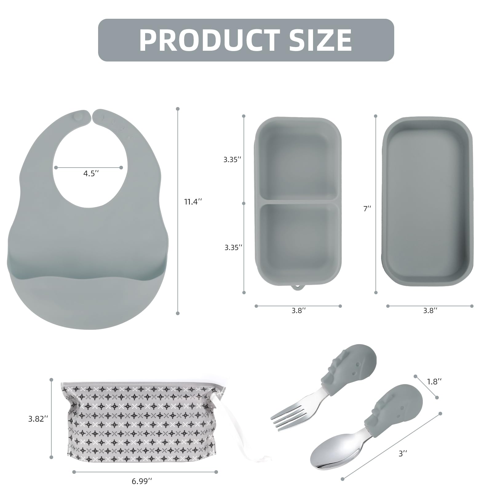 - Q: What is included in the 6-piece feeding kit? A: The kit includes two silicone dinner plates with suction cups, a stainless steel fork, a stainless steel spoon, a foldable bib, and a waterproof storage bag.