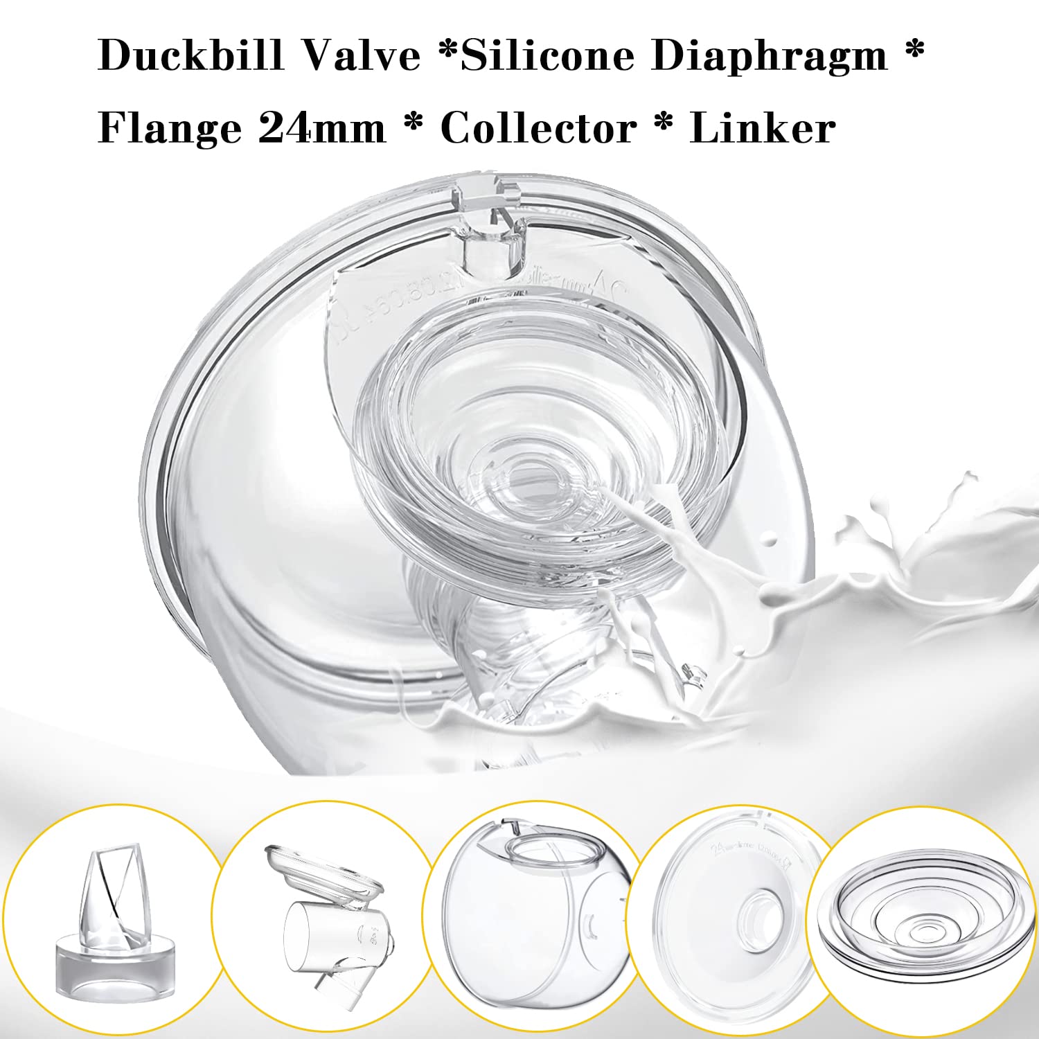 - Q: What is included with the wearable breast pump milk collector cup? A: The package includes the wearable breast pump milk collector cup, a duckbill valve, a silicone diaphragm, a 24mm flange, a milk collector, and a linker.