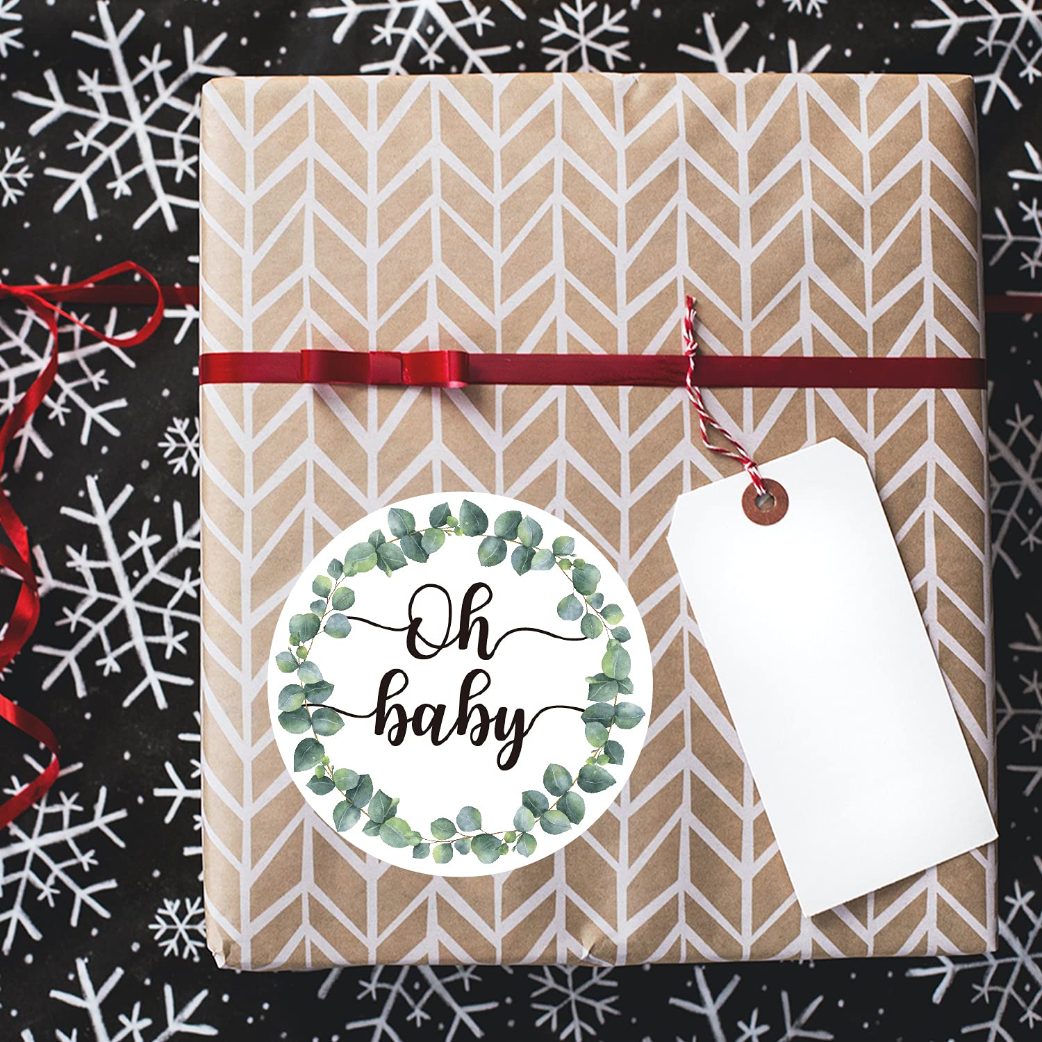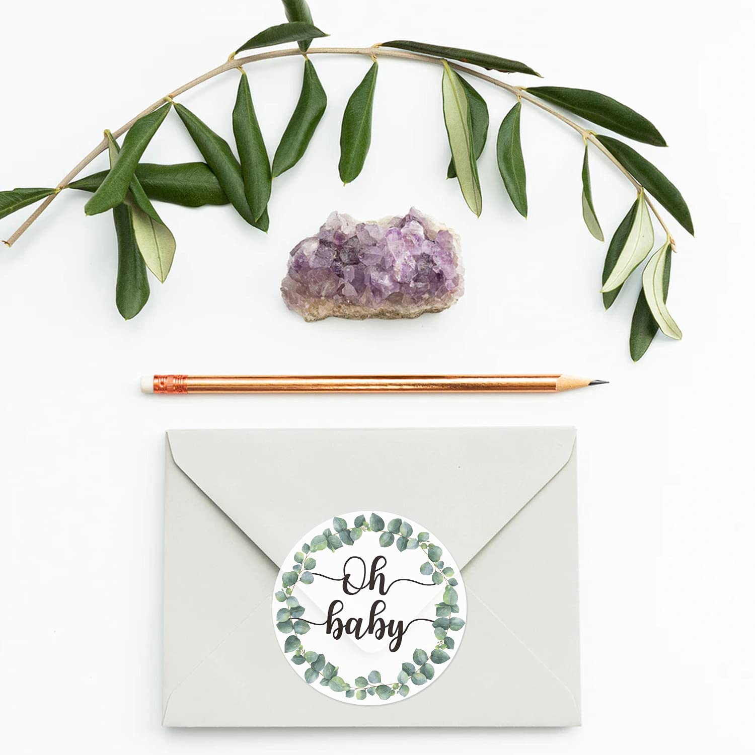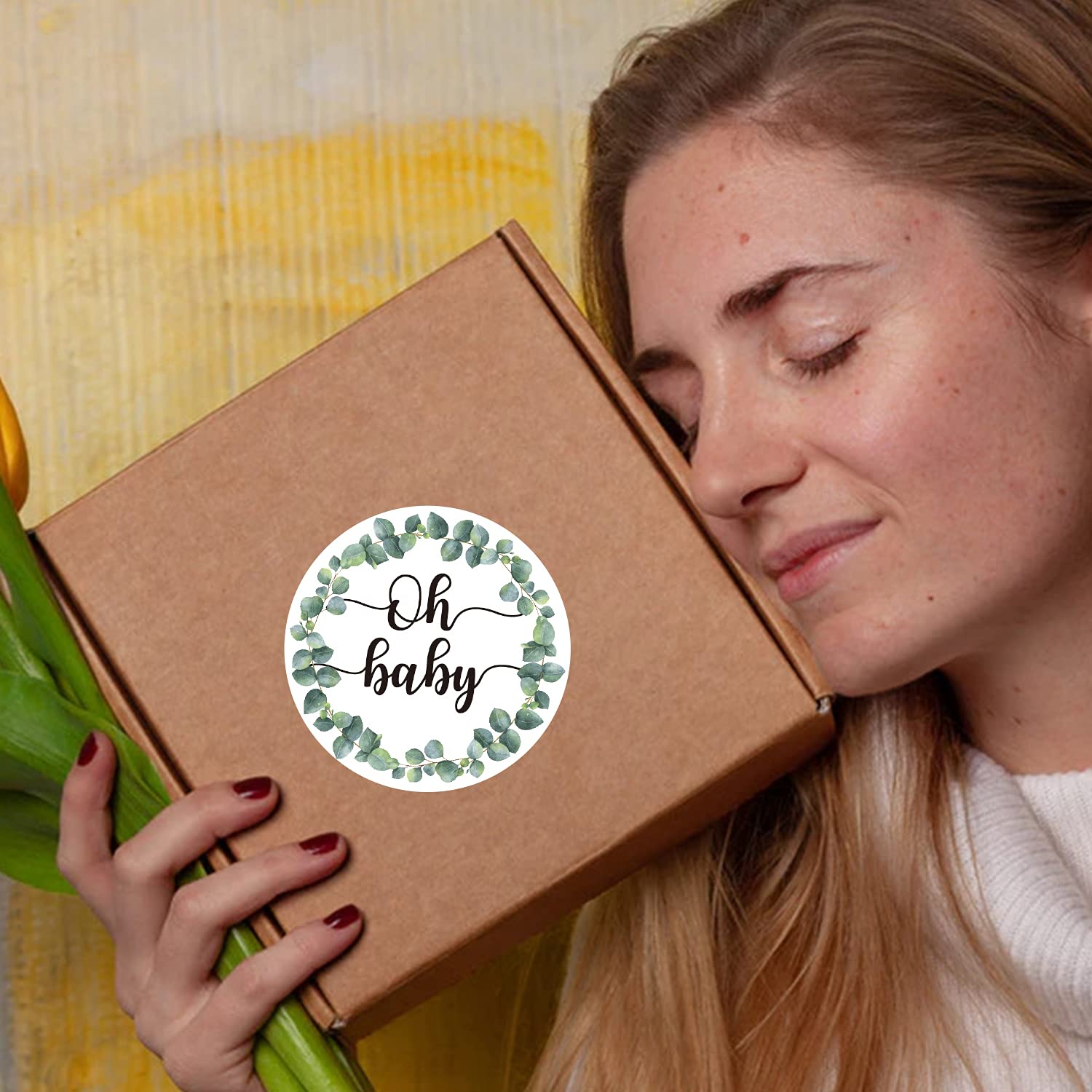 - Q: What type of designs are featured on the stickers? A: The stickers feature a greenery theme and are marked with 'Oh Baby' for a gender-neutral appeal.