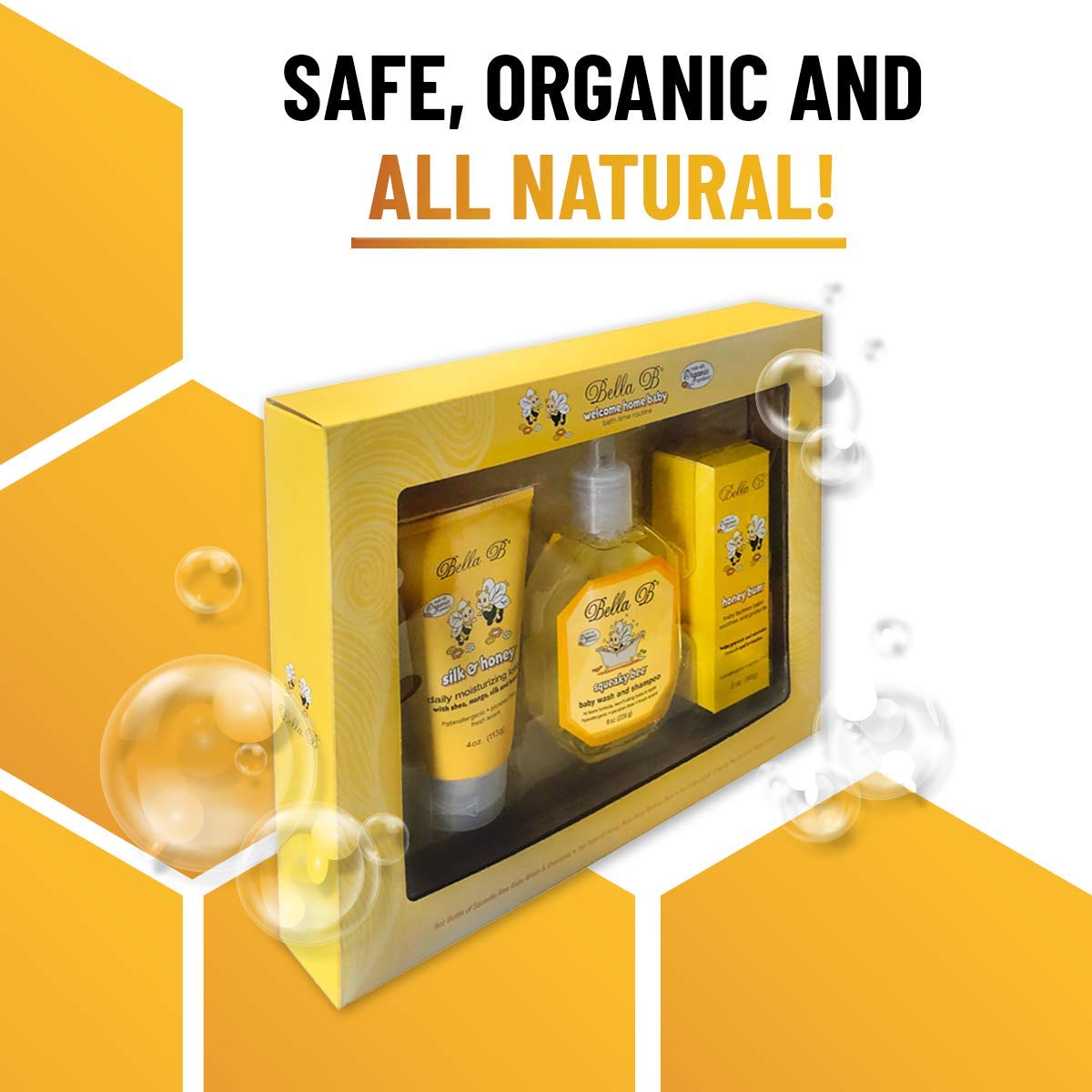 - Q: What products are included in the Bella B Baby Starter Set? A: The Bella B Baby Starter Set includes 11 full-size products such as Squeaky Bee Hair/Body Wash, Bee Gone Cradle Cap Shampoo, Silk & Honey Lotion, Honey Bum Diapering Cream, Baby Massage Oil, and Baby Wipes.