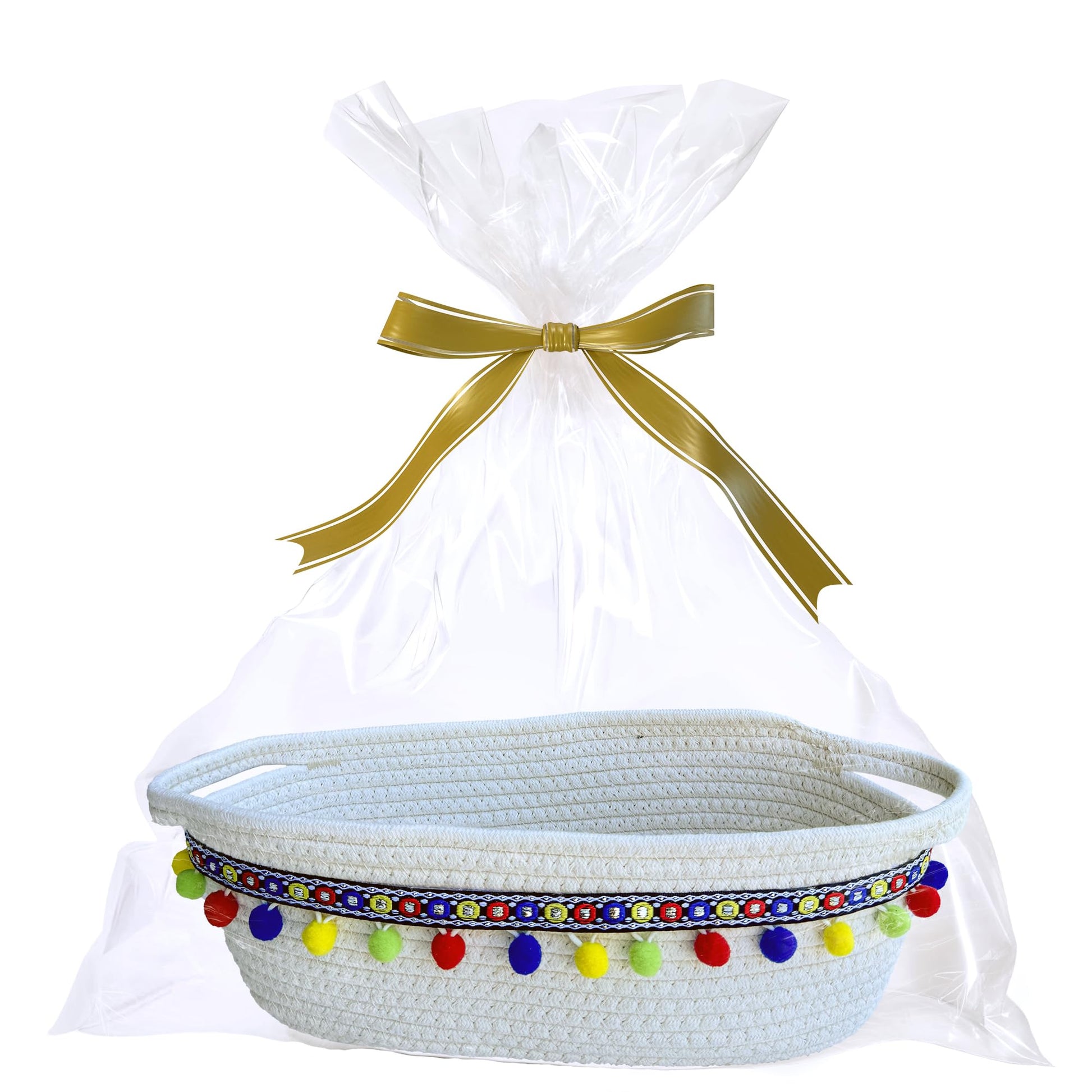 - Q: What colors are available for the YELLOW LOTUS Large Gift Basket? A: The basket is primarily white and features colorful boho rainbow tassels.