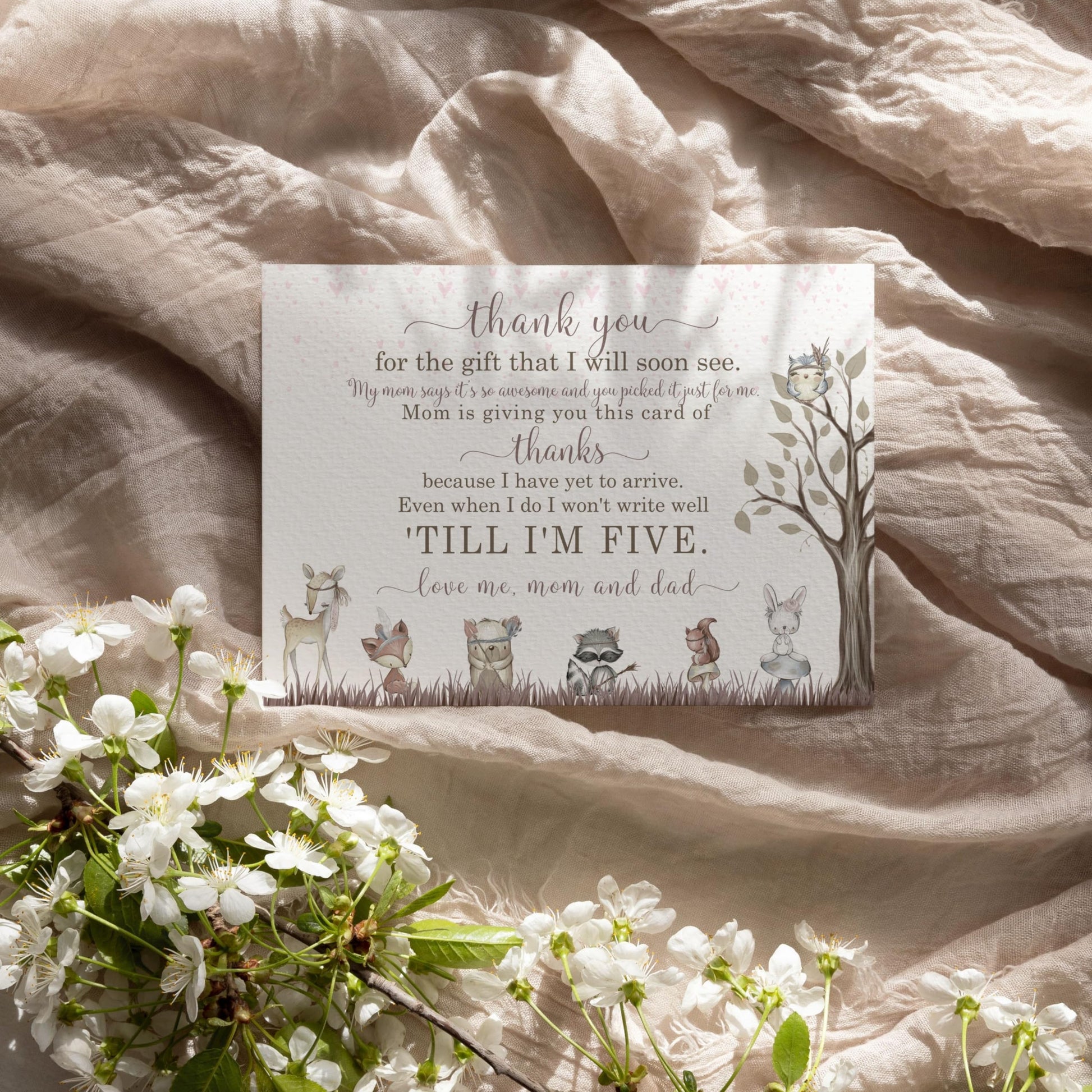 - Q: What is the design of the thank you cards? A: The thank you cards have a charming woodland theme with boho pink accents, making them perfect for a girls' baby shower.