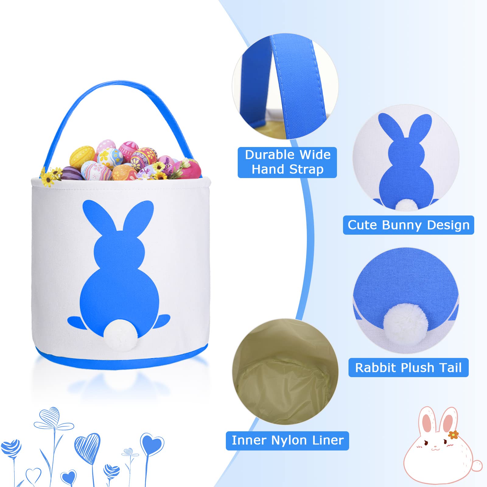- Q: What are the dimensions of the Easter bunny basket bags? A: Each basket bag measures approximately 9.1 inches by 9.4 inches, excluding the handle.