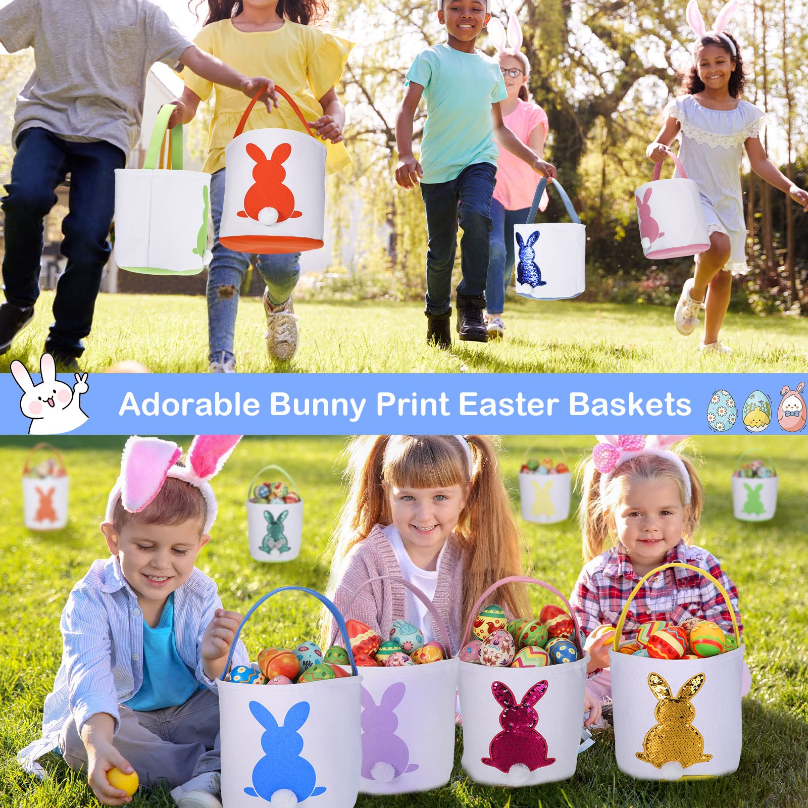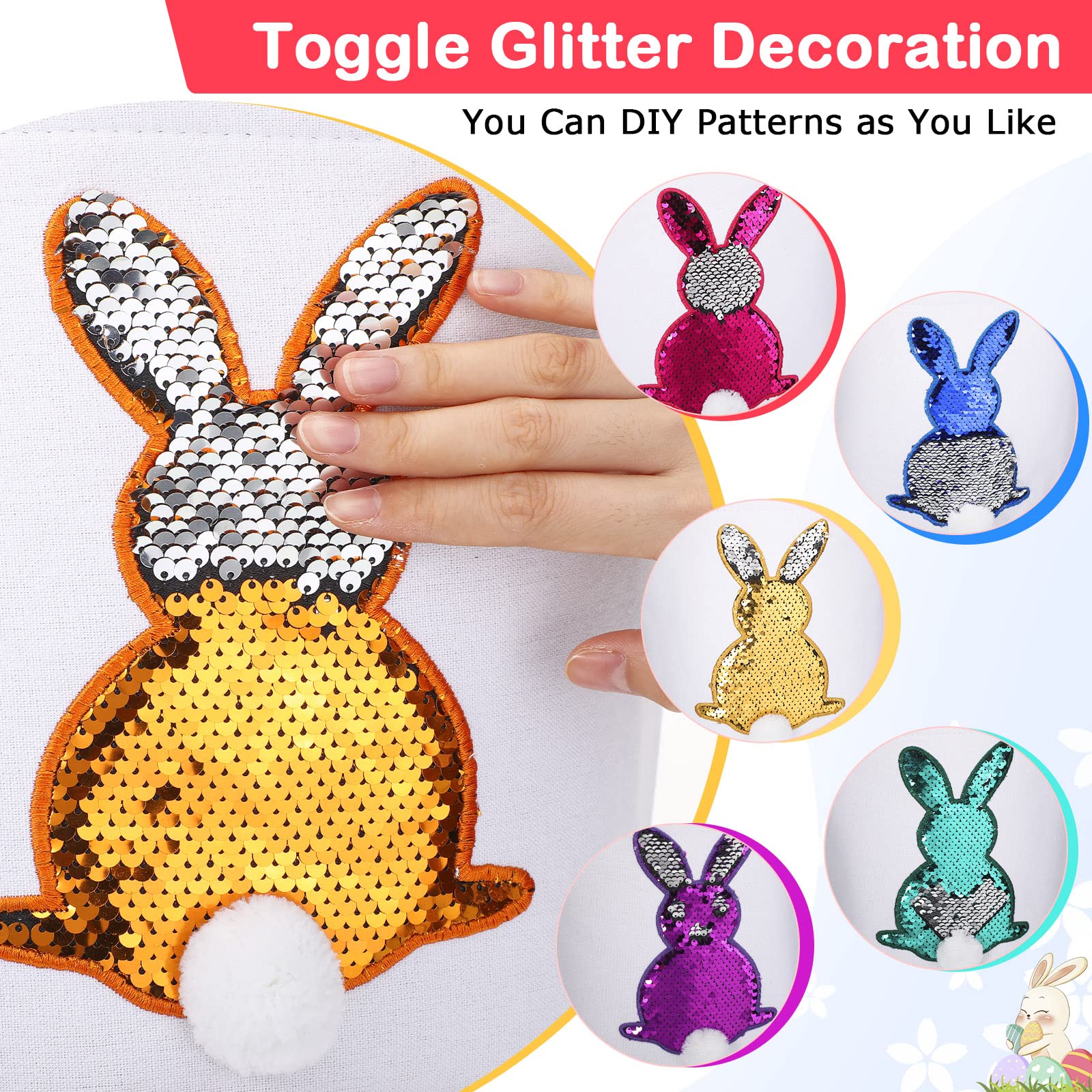 - Q: What is included in the Jexine Easter Bunny Basket Bags set? A: The set includes 12 pieces of reusable Easter bunny basket bags, featuring 2 designs (matte and sequin) and 6 different vibrant pattern colors.
