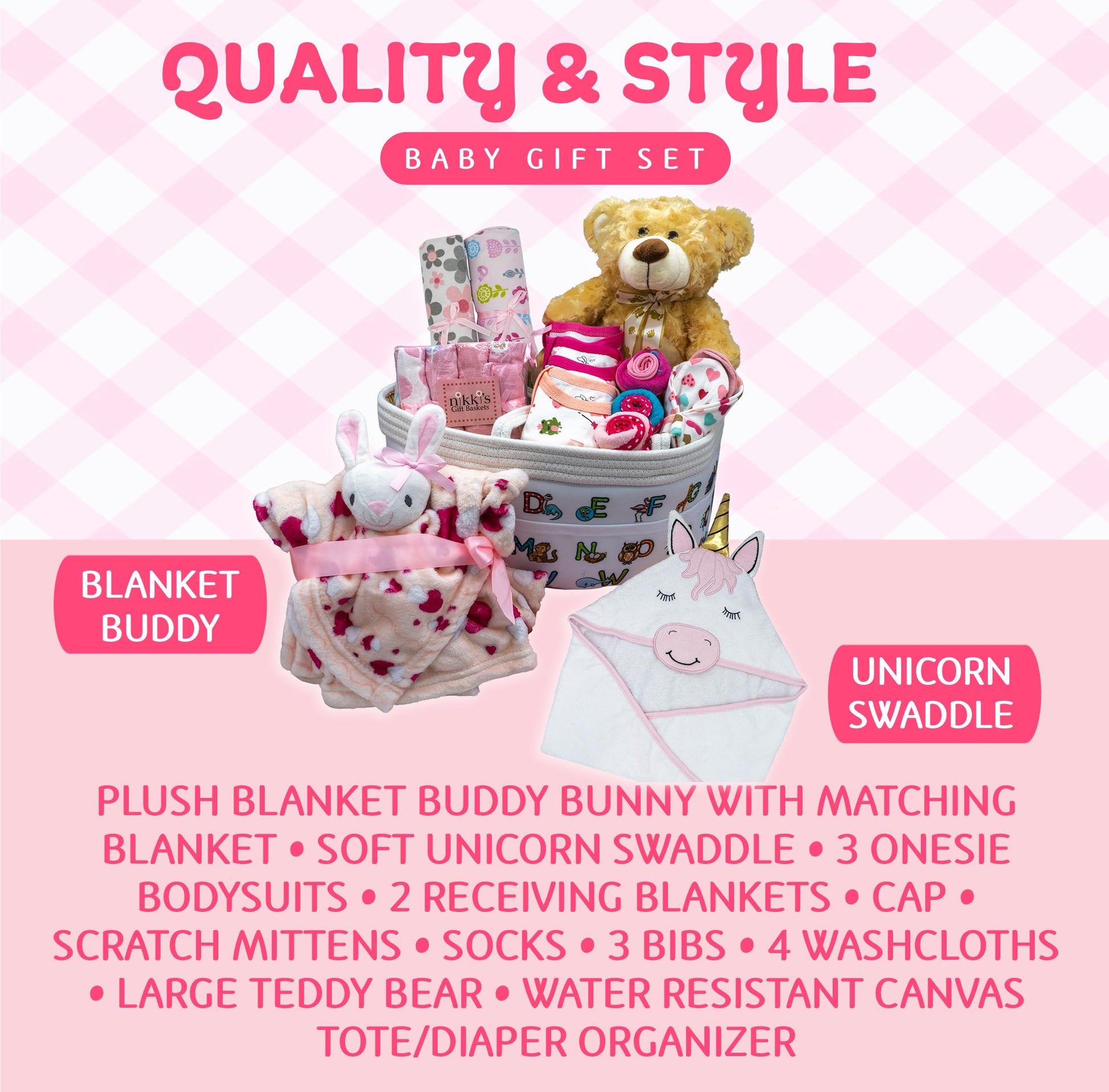 - Q: What items are included in the Joyful Arrival Deluxe Baby Girl Gift Basket? A: The gift basket includes three soft cotton bodysuits, a bunny blanket buddy with a matching blanket, a unicorn swaddle, socks, mittens, two receiving blankets, four washcloths, three bibs, a teddy bear, and an ABC tote/diaper organizer.