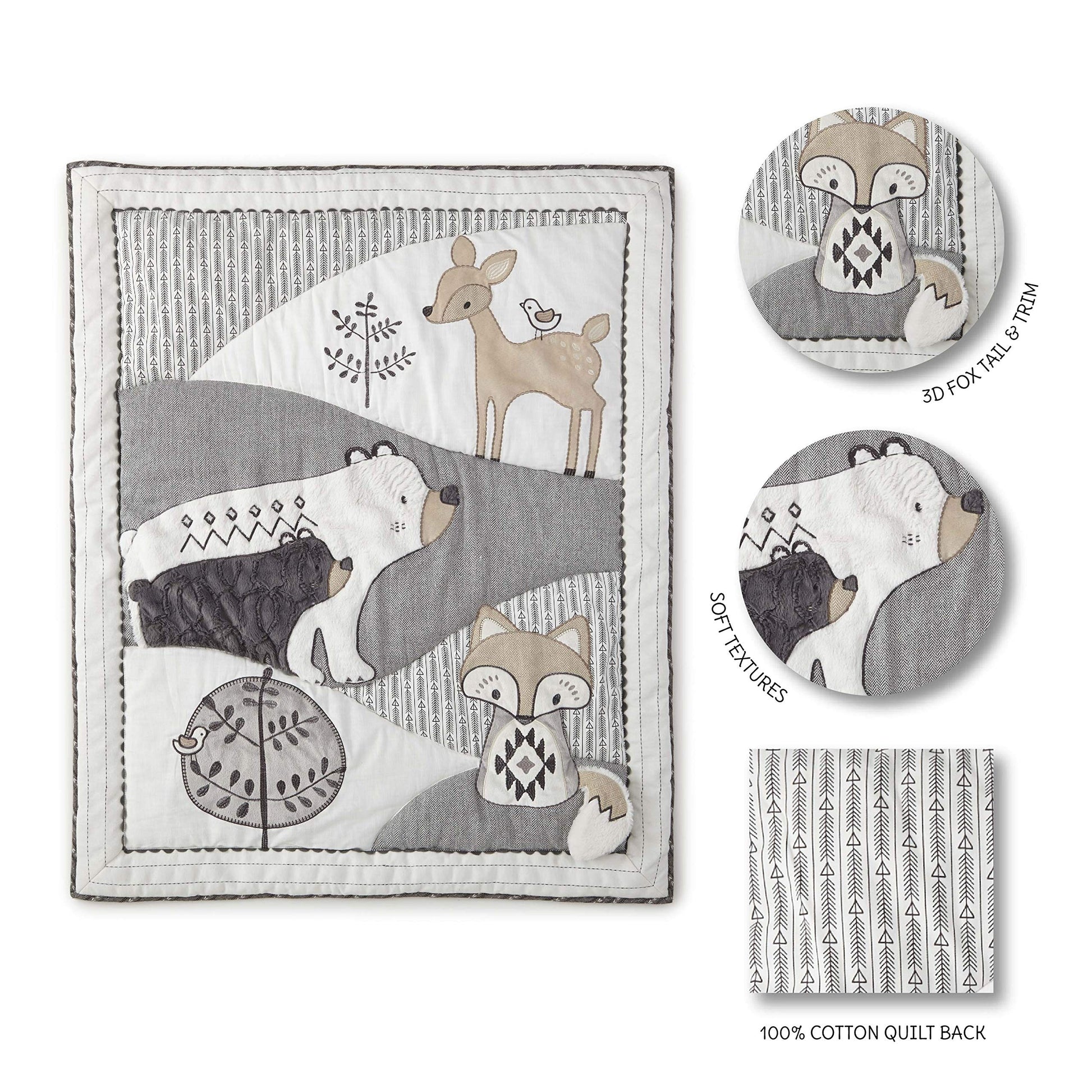 - Q: What are the dimensions of the quilt in the Bailey Crib Bed Set? A: The dimensions of the quilt in the Bailey Crib Bed Set are approximately 36 inches by 45 inches.