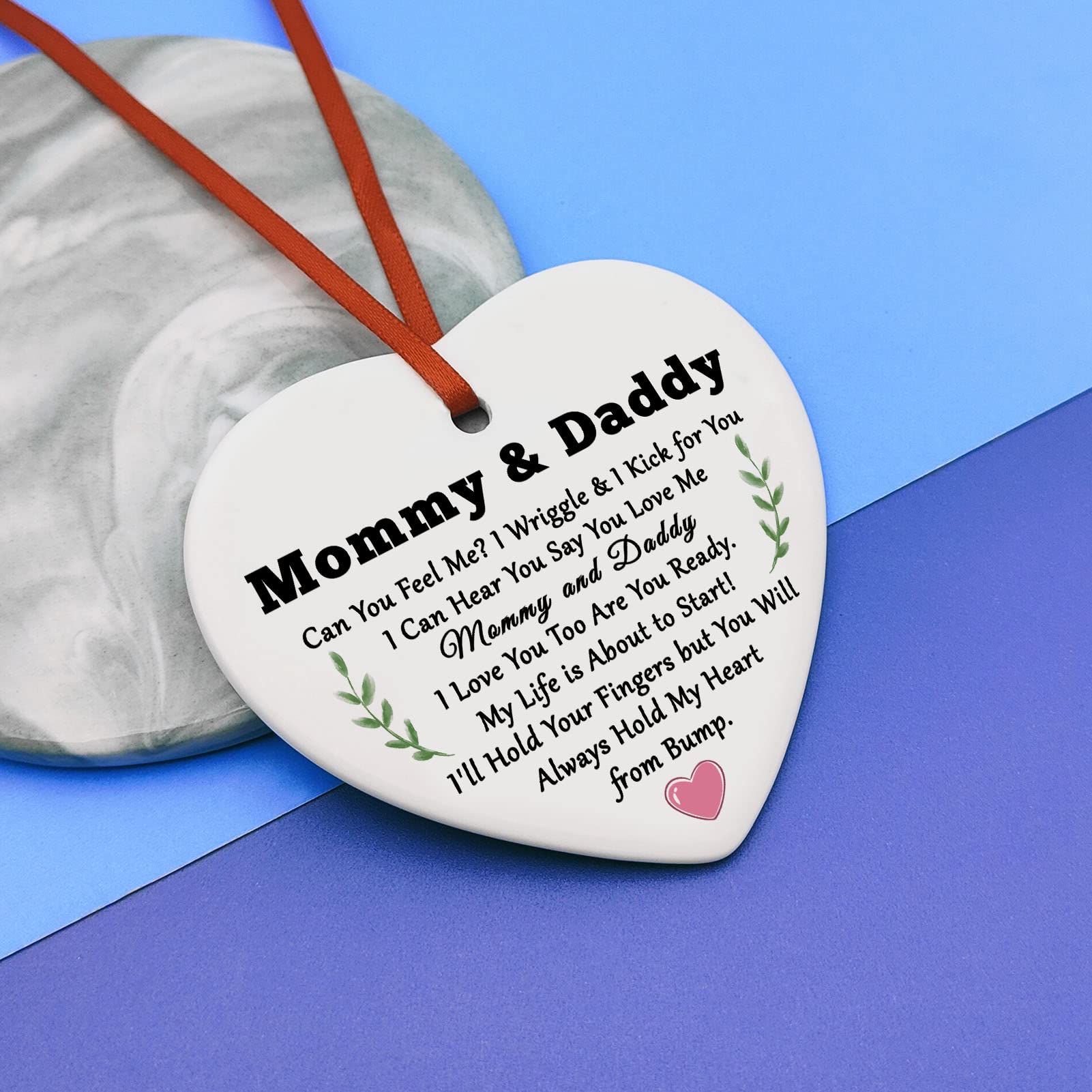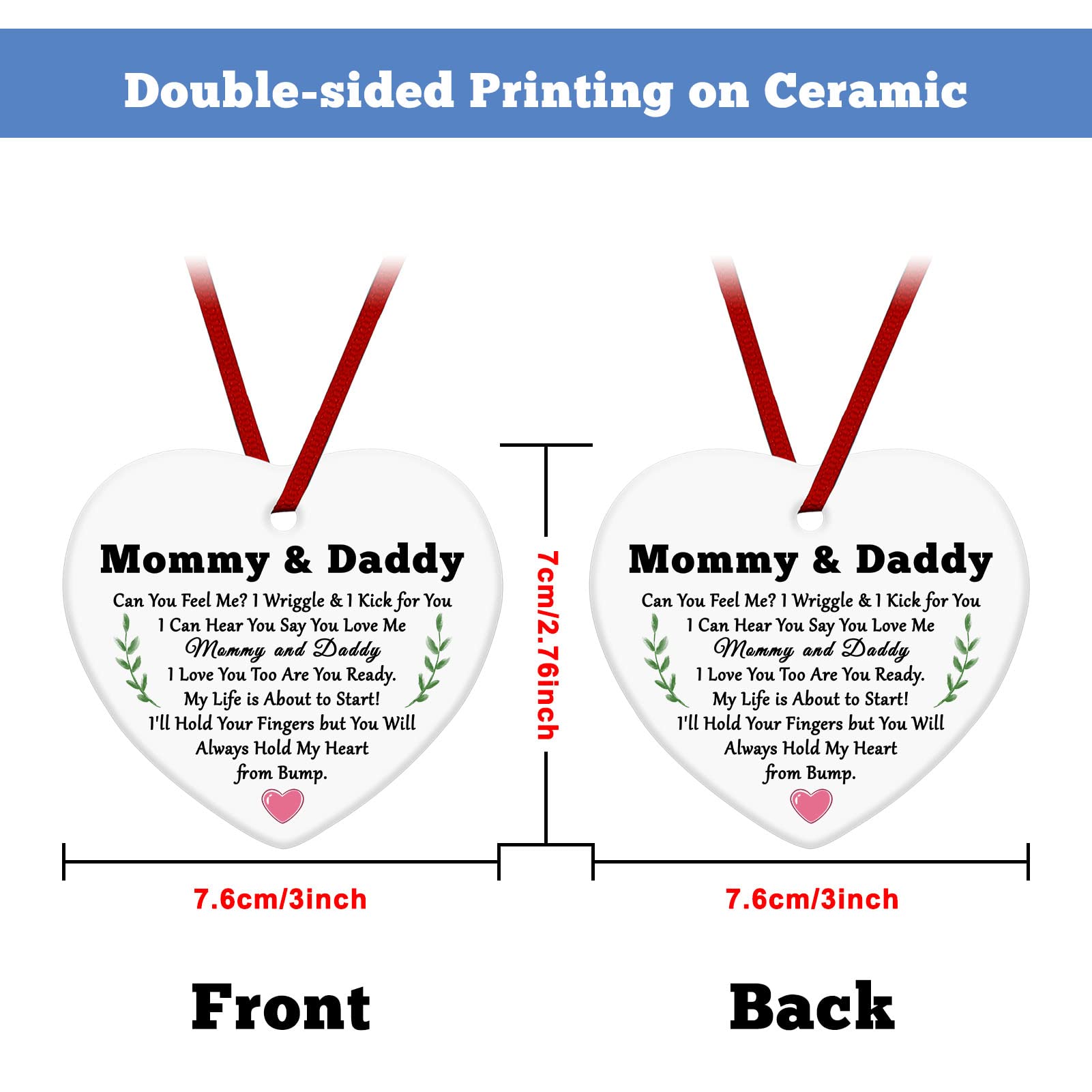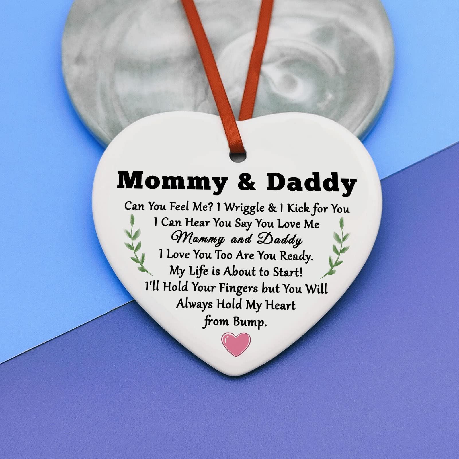 - Q: What does the ornament say? A: The ornament features a heartfelt message: 'Mommy & Daddy Can you feel me? I wriggle & I kick for you... I'll hold your fingers but you will always hold my heart from bump.'