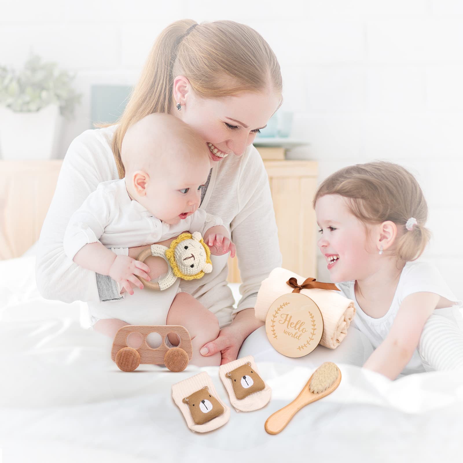 - Q: What items are included in the New Born Baby Gift Basket? A: The New Born Baby Gift Basket includes a baby blanket, baby brush, baby socks, wooden lion rattle, wooden milestone card, and a wooden car toy.