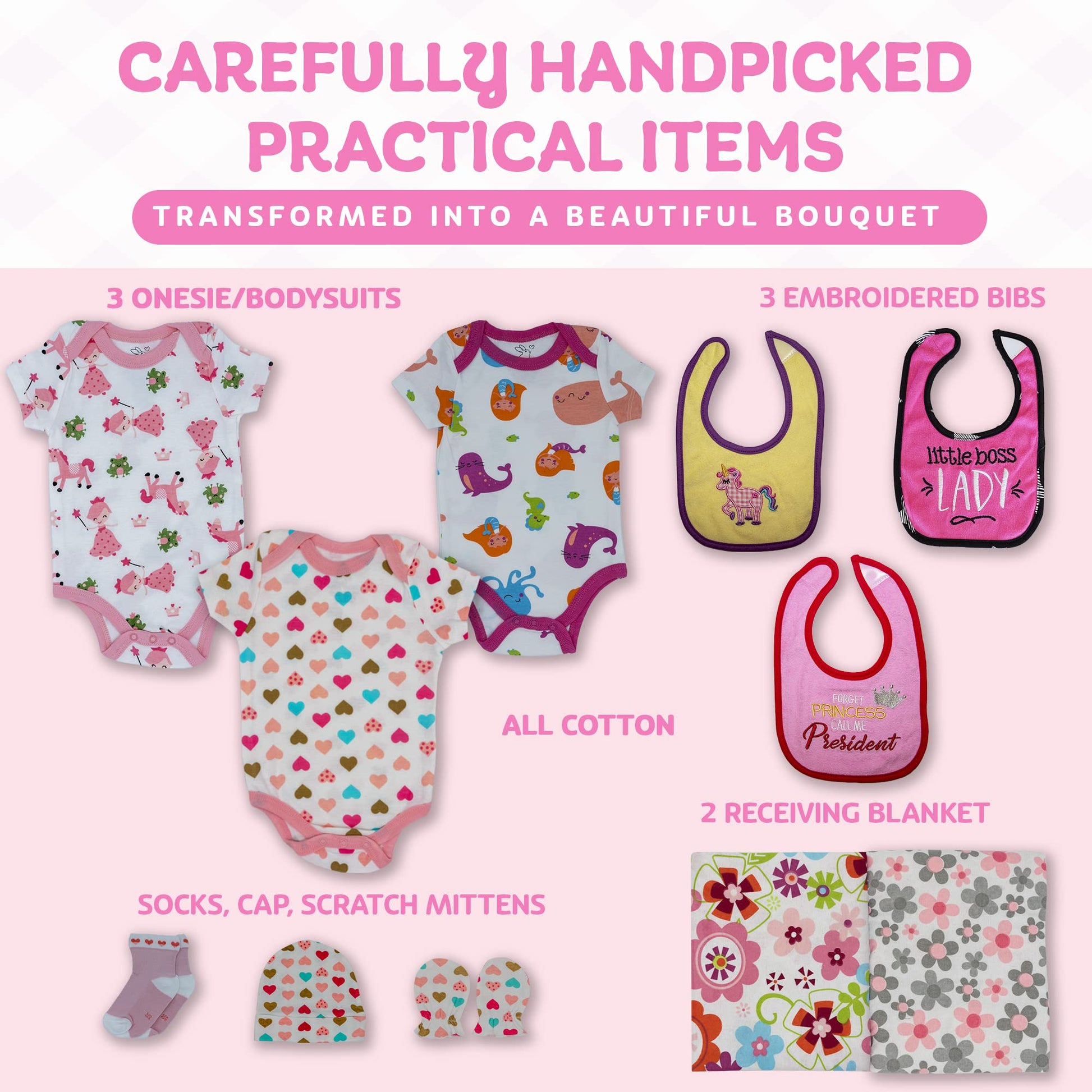 - Q: What items are included in the Deluxe Baby Blossom Baby Girl Gift Set? A: The Deluxe Baby Blossom Baby Girl Gift Set includes four onesies (3-6 month size), two receiving blankets, two bibs, a cap, a pair of socks, and a pair of mittens.