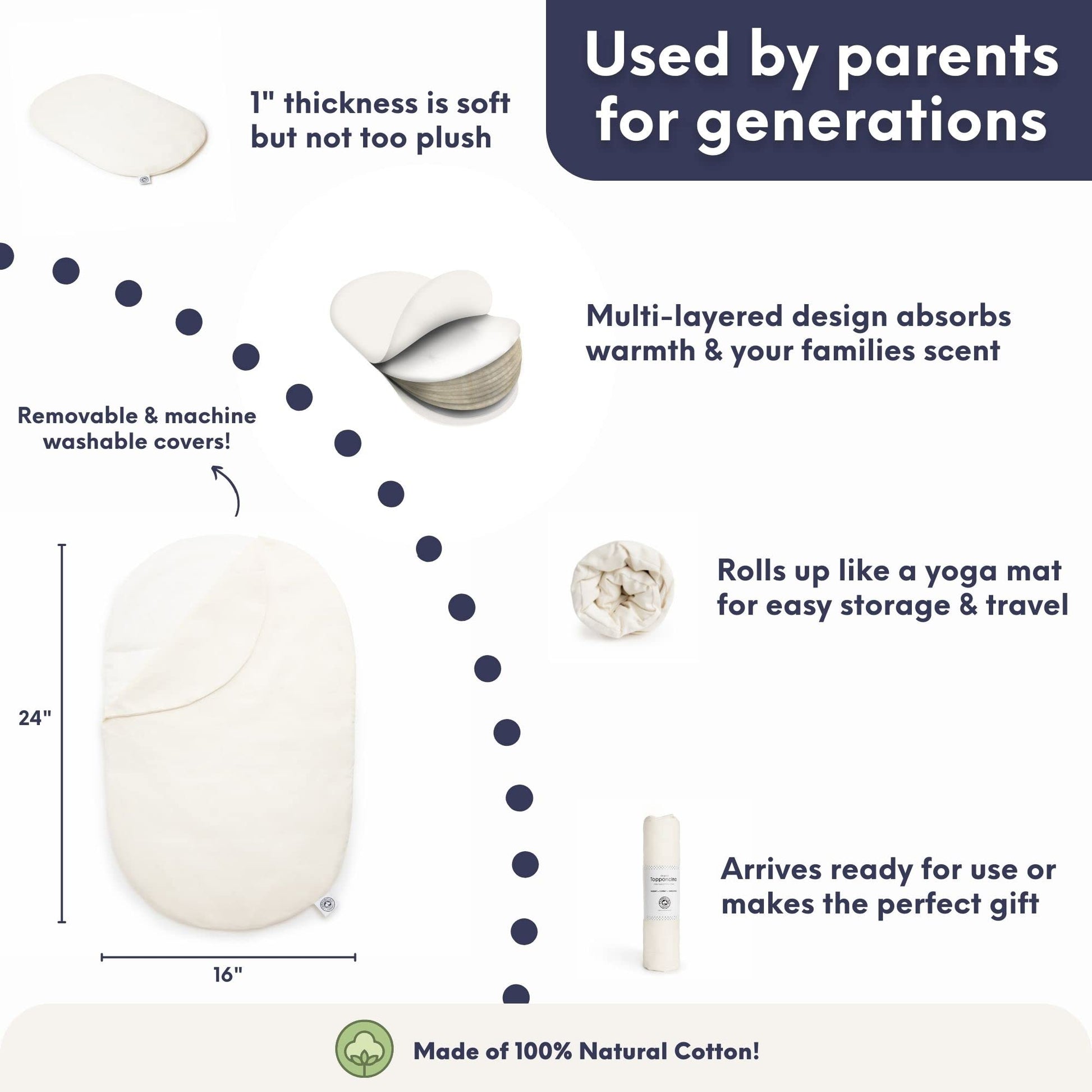 - Q: What materials are used in the Topponcino? A: The Topponcino is made from 100% natural cotton, ensuring a soft and safe surface for your baby.