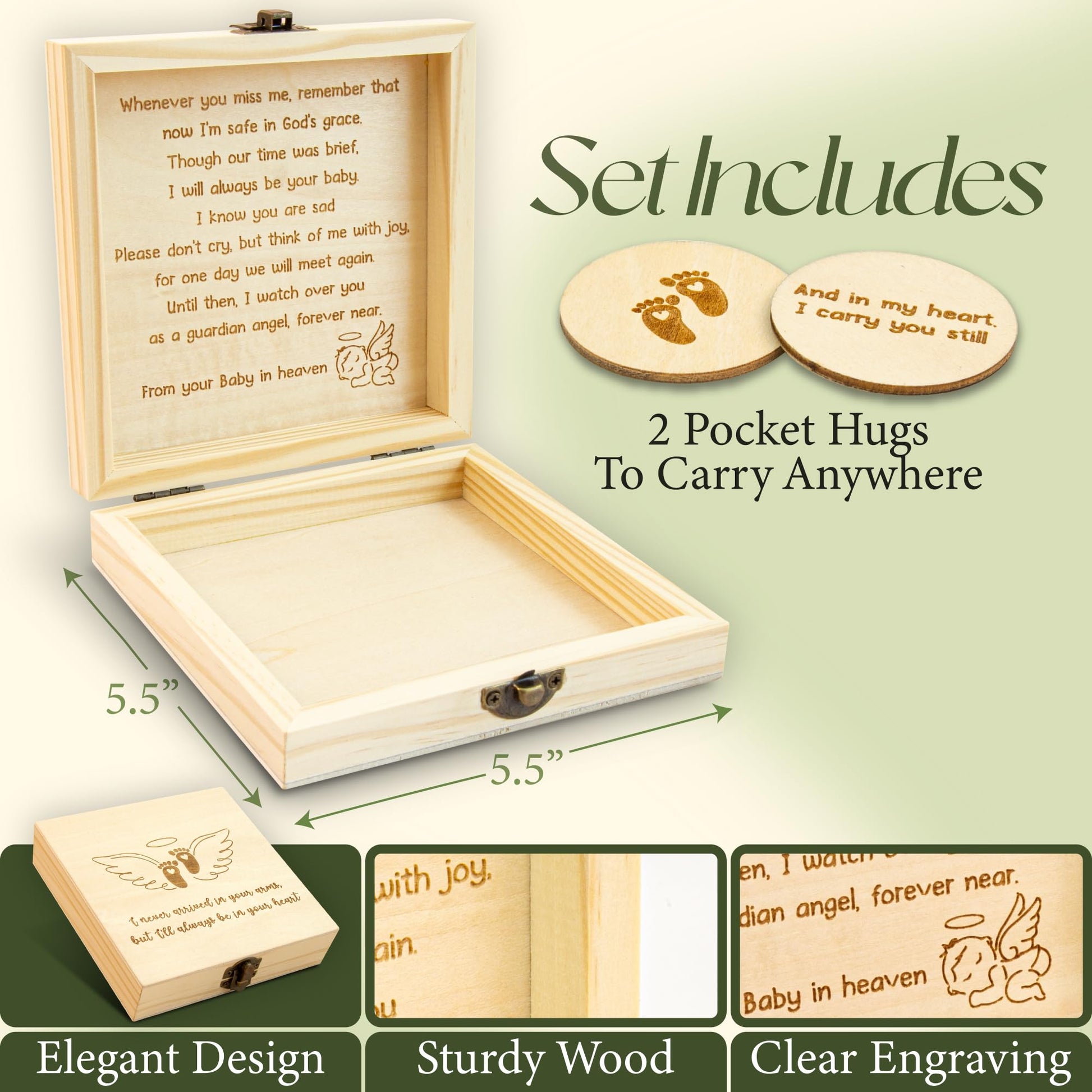 - Q: What is included in the Woodamore Miscarriage Memory Box? A: The Woodamore Miscarriage Memory Box includes a beautifully crafted wooden box designed to hold cherished memories, along with two wooden pocket hugs in a round shape for added comfort.