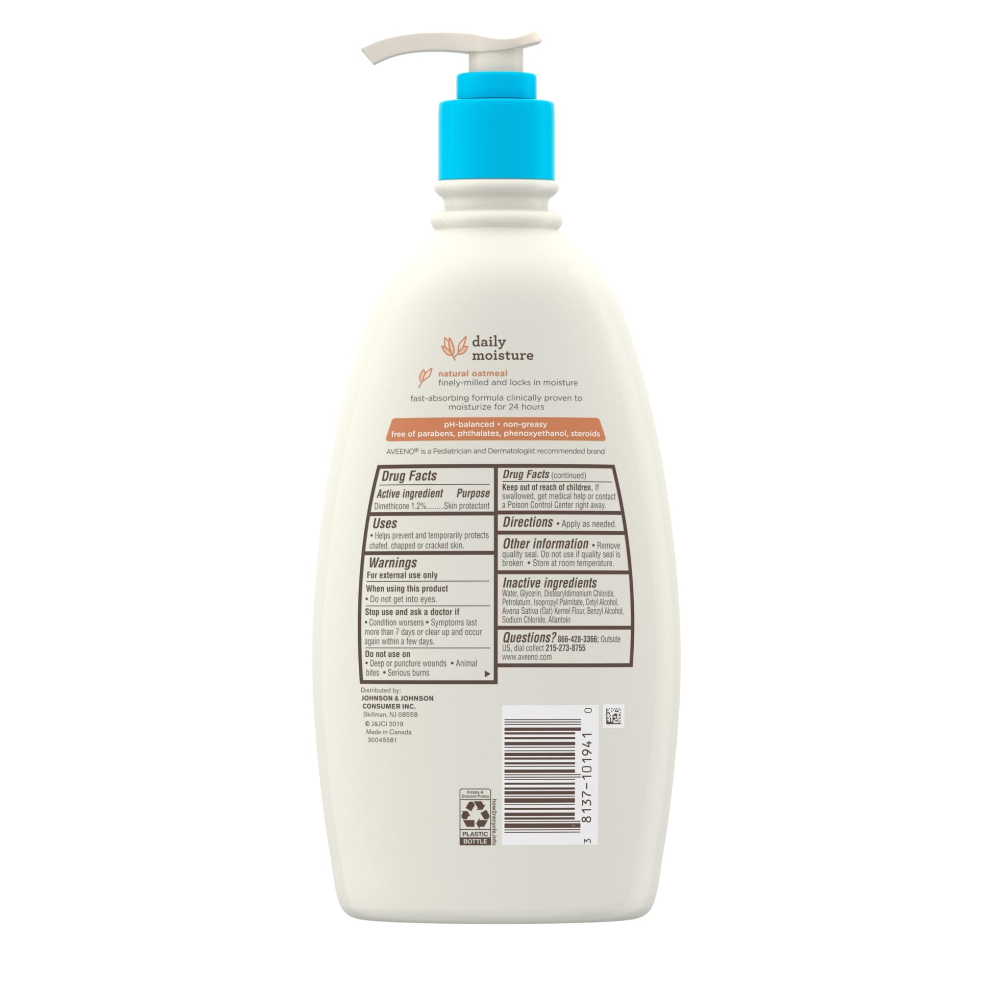 - Q: What ingredients are in Aveeno Baby Daily Moisture Lotion? A: The lotion contains natural colloidal oatmeal and dimethicone, which help to moisturize and protect your baby's skin.