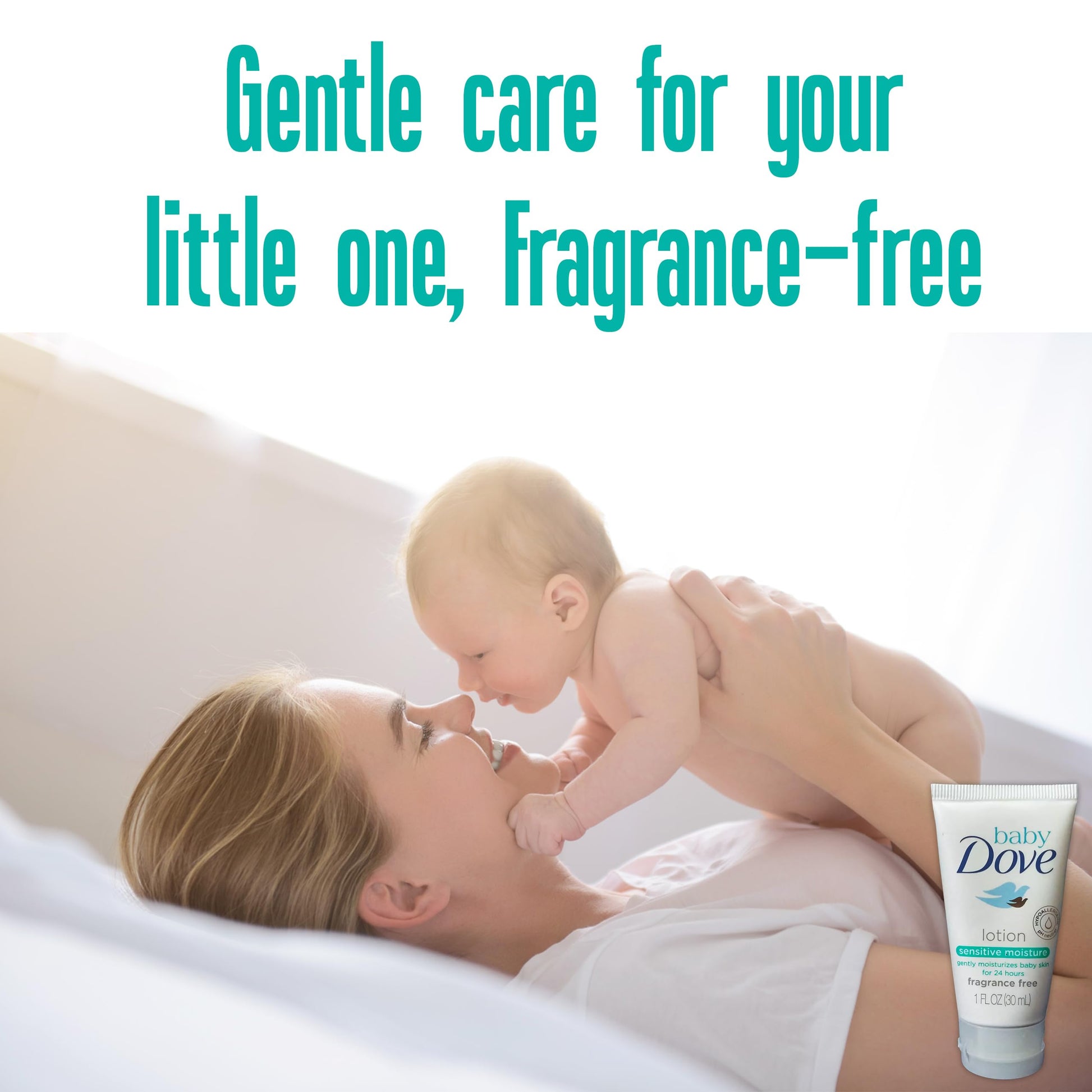 BABY DOVE SENSITIVE MOISTURE FRAGRANCE-FREE LOTION Your babys delicate skin deserves the best care. Baby Dove Sensitive Moisture Fragrance-Free Lotion is designed to keep your little ones skin soft, smooth, and nourished for a full 24 hours. From the first use, it helps soothe dry, sensitive, and eczema-prone skin, giving your baby the gentle moisture they need. vHypoallergenic and Safe for Sensitive Skin We know how important it is to use safe and gentle products on your baby. Thats why our fragrance-free baby lotion is dermatologist- and pediatrician-tested and made with skin-natural nutrients to help maintain moisture balance. Its hypoallergenic, non-irritating, and free from dyes, parabens, and phthalates, making it perfect for even the most delicate skin. Perfect for On-the-Go Hydration This pack of 6 travel-size bottles (1 fl oz each) is just the right size for diaper bags, purses, and travel. Whether youre at home, out for the day, or on vacation, youll always have a gentle baby moisturizer within reach to keep your babys skin soft and healthy. Fast-Absorbing and Non-Greasy No one likes a sticky, greasy lotion-especially not your little one! Our lightweight baby lotion absorbs quickly, leaving skin silky smooth without any heavy residue. Its the perfect addition to your baby skincare routine, providing comfort and hydration without the mess. Baby Dove: A Brand You Can Trust At Baby Dove, we believe in nurturing babys skin with gentle, caring formulas. Our Sensitive Moisture Baby Lotion is crafted to protect, hydrate, and soothe, so you can feel confident knowing youre giving your baby the best skincare from the very start.